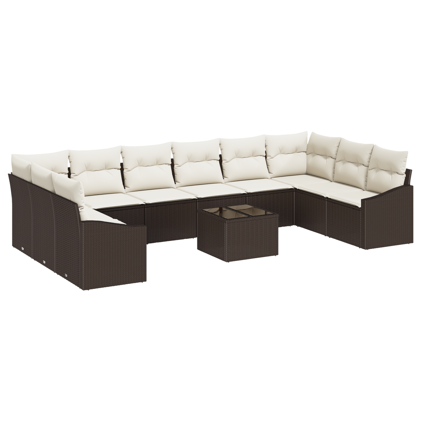 Dieses 10-teilige Outdoor-Sofa-Set aus hochwertigem Poly-Rattan mit weichen Kissen ist stylish und praktisch für deinen Außenbereich. Es ist perfekt für Zusammenkünfte und das modulare Ecksofa passt sich deinen Garten-, Patio- oder Balkonbedürfnissen an, um eine gemütliche Atmosphäre für entspannende Nachmittage oder lebhafte Abende zu schaffen. Wetterfeste Materialien: Aus hochwertigem Poly Rattan gefertigt, hält das Sofa-Set Sonne und Regen stand und sieht lange gut aus. Bequeme Sitzplätze: Die Kissen sind weich und stützend, damit du stundenlang draußen sitzen kannst. Vielseitiges modulares Design: Die sectionale Anordnung lässt sich leicht ändern, um deinen Raum für kleine Treffen oder große Party anzupassen. Einfache Pflege: Die Kissen haben Reißverschlüsse, damit du sie schnell abnehmen und reinigen kannst – so bleibt dein Set frisch. Elegante Optik: Die moderne Oberfläche und das geflochtene Muster verleihen jedem Außenbereich einen schicken Akzent, der deine Freunde und Familie beeindrucken wird.