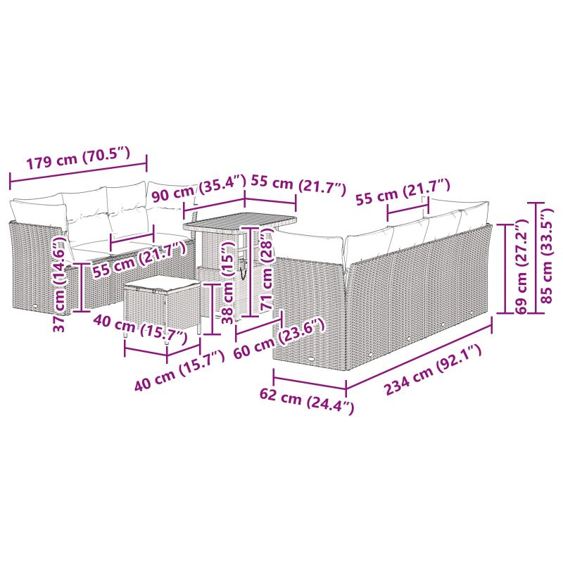 Dieses Garten Sofa Set kombiniert modernen Stil mit Praktikabilität und bietet eine tolle Mischung aus Aussehen und Komfort für die Entspannung im Freien. Mit seinem eleganten schwarzen Poly-Rattan-Gestell und bequemen Kissen bietet es Platz für bis zu sechs Personen - perfekt für Treffen auf deiner Terrasse oder deinem Balkon. Das modulare Design erlaubt es dir, das Sofa Set an deinen Platz und Bedürfnisse anzupassen, perfekt für diverse Außenbereiche. Handgewebt aus robustem Poly-Rattan garantiert es Langlebigkeit und überzeugt durch sein stylisches Aussehen, das auch wechselnde Wetterbedingungen aushält. Die verstellbaren Füße sorgen für Stabilität auf unebenen Flächen und machen das Sofa vielseitig einsetzbar für jede Terrasse oder jeden Garten. Die Kissen sind bequem und mit Reißverschluss ausgestattet, was die Reinigung erleichtert. Der große Kaffeetisch bietet zusätzliche Funktionalität und ist ideal für Erfrischungen bei Outdoor-Partys.