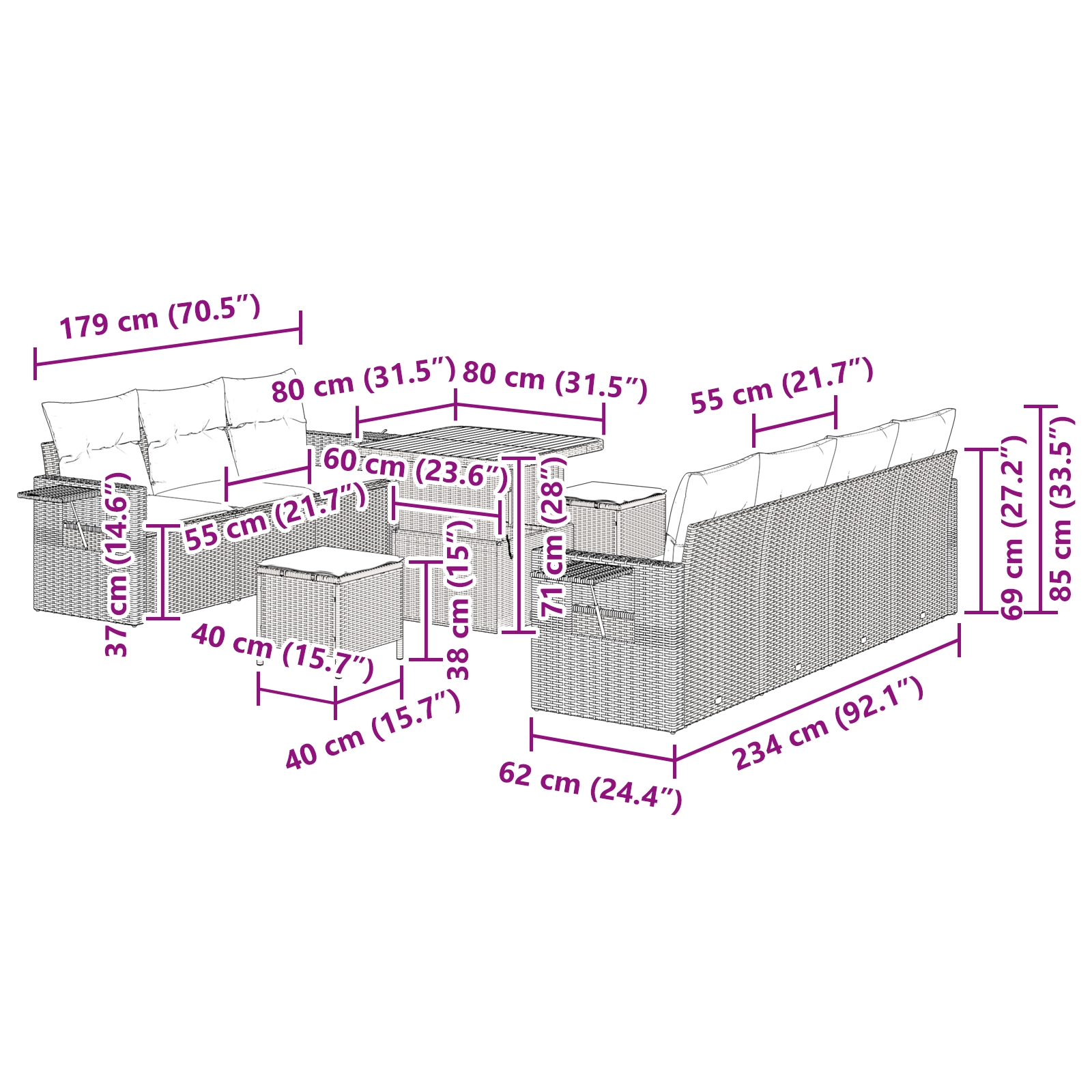 Das 10-teilige Garten Sofaset ist perfekt für entspanntes Lounging im Freien. Das modulare Design macht es super einfach, sich in jedes Patio, Balkon oder Gartenplatz einzufügen, perfekt um mit Freunden abzuhängen oder einfach nur zu relaxen. Modulare Vielseitigkeit: Das clevere modulare Design dieses Sofasatzes lässt sich easy umstellen, perfekt, um Gäste zu empfangen oder gemütliche Ecken zum Quatschen zu schaffen. Ändere dein Outdoor-Ambiente im Nu für jeden Anlass. Großer Komfort: Die plüschigen Kissen bieten dir einen super weichen Stoff, der dich beim Entspannen im Freien immer bequem hält. Sie sind so gemacht, dass sie ihre Form behalten und gut unterstützen, damit du und deine Freunde jeden Moment im Freien genießen könnt. Robuste Materialien für draußen: Hergestellt aus wetterbeständigem Rattan und strapazierfähigem Polyester, ist dieses Möbelset stark genug, um den Elementen standzuhalten und dabei immer gut auszusehen. Genieß das gute Gefühl, dass dein Investment vor UV-Strahlen und Regen geschützt ist. Elegante Ästhetik: Mit ihrem schlanken Design und dem stilvollen matten Finish sorgt es dafür, dass dein Außenbereich chic aussieht. Egal ob auf deinem Balkon oder in einem großen Garten, dieses Möbelset wird dein Ambiente verbessern. Erweiterte Funktionalität: Ideal für Außenbereiche ermutigt dieses Set zum Sozialisieren und Entspannen. Mit Platz für sechs Personen, die bequem sitzen können, ist es perfekt für Familientreffen, BBQs oder einfach für den Chill mit Freunden.