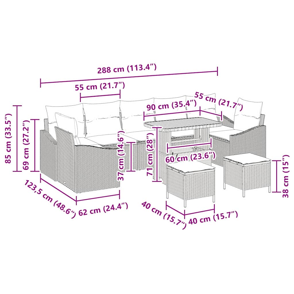 - Lieferumfang: 1 Tisch mit höhenverstellbarem Tisch, 4 Sofateile, Kissen