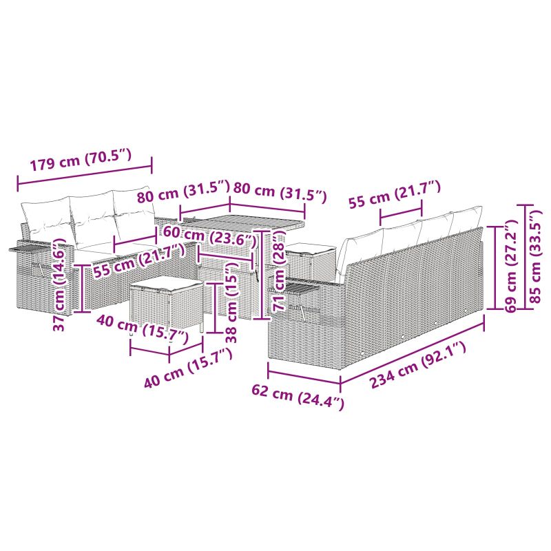 Das 10-teilige Garten Sofa Set revolutioniert das Outdoor-Lounging, indem es Stil und Praktikabilität perfekt vereint. Mit dem modularen Layout macht dieses Set jede Terrasse, jeden Balkon oder Garten zum idealen Ort für gesellige Treffen oder entspannte Momente. Modulare Vielseitigkeit: Das clevere modulare Design dieses Sofa Sets macht es einfach, umzustellen – ideal um deinen Raum für Gäste oder gemütliche Gespräche zu optimieren. Verändere deinen Außenbereich mühelos für jeden Anlass und wechsle die Layouts schnell. Großer Komfort: Dieses Set hat bequeme Kissen in softer Stoffhülle, die für höchstmögliche Entspannung bei langen Lounging-Sessions im Freien sorgt. Die Polsterung behält ihre Form und gibt guten Halt, damit du und deine Gäste draußen eine tolle Zeit habt. Robuste Outdoor Materialien: Hergestellt aus handgewebtem Poly Rattan und solidem Stahl, ist dieses Möbelset dafür gemacht, dem Wetter zu trotzen und dabei schön zu bleiben. Entspanne, denn deine Investition ist vor UV-Strahlen und Regen geschützt. Elegante Ästhetik: Das schlichte moderne Design mit schickem matten Finish verleiht deinem Außenbereich einen klasse Look. Ob Balkon oder großer Garten, dieses Sofa Set wertet deinen Platz auf. Erhöhte Funktionalität: Perfekt für Außenbereiche ermutigt this Set zum Zusammenkommen und Entspannen. Mit Platz für bis zu sechs Personen ist es super für Familienfeiern, Grillabende oder entspannte Treffen mit Freunden.