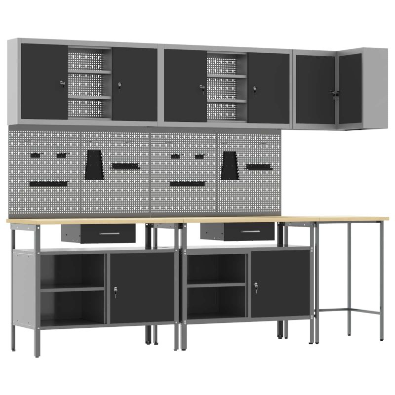 Dieser Ecktisch bringt einen stylischen industriellen Look in deine Garage oder Werkstatt und kombiniert Stil mit Funktionalität. Das schicke graue Finish und die Holz-ähnliche Oberfläche passen perfekt, wenn du einen cleanen, aber coolen Trend magst. Höhenverstellbare Füße: Damit kannst du den Tisch ganz einfach auf unebenen Böden stabilisieren, perfekt für verschiedene Orte. Ob in der Garage oder Werkstatt, sorgt dafür, dass alles stabil bleibt, sodass du ohne Probleme arbeiten kannst. Viel Stauraum: Er hat jede Menge Regale, um deine Werkzeuge und Kleinteile zu verstauen, was dir hilft, deinen Raum ordentlich zu halten und schnell das zu finden, was du brauchst. Robustes Material: Aus Stahl und Holzwerkstoff gefertigt, kann dieser Tisch viel aushalten. Der Stahlrahmen ist stabil und die Holz-ähnliche Oberfläche sieht gut aus und ist einfach zu reinigen. Vielseitig einsetzbar: Dieser Ecktisch ist ein praktischer Arbeitsplatz, perfekt, um deine Werkzeuge in Garagen oder Werkstätten organisiert zu halten. Er eignet sich auch super für Hobbys oder Basteln und bietet eine zuverlässige Fläche für die, die Dinge erledigen müssen. Platzsparendes Design: Die Eckform ist ideal für kleinere Räume und passt gut in deine Garage oder Werkstatt, sodass der Boden Platz für andere Dinge frei macht.