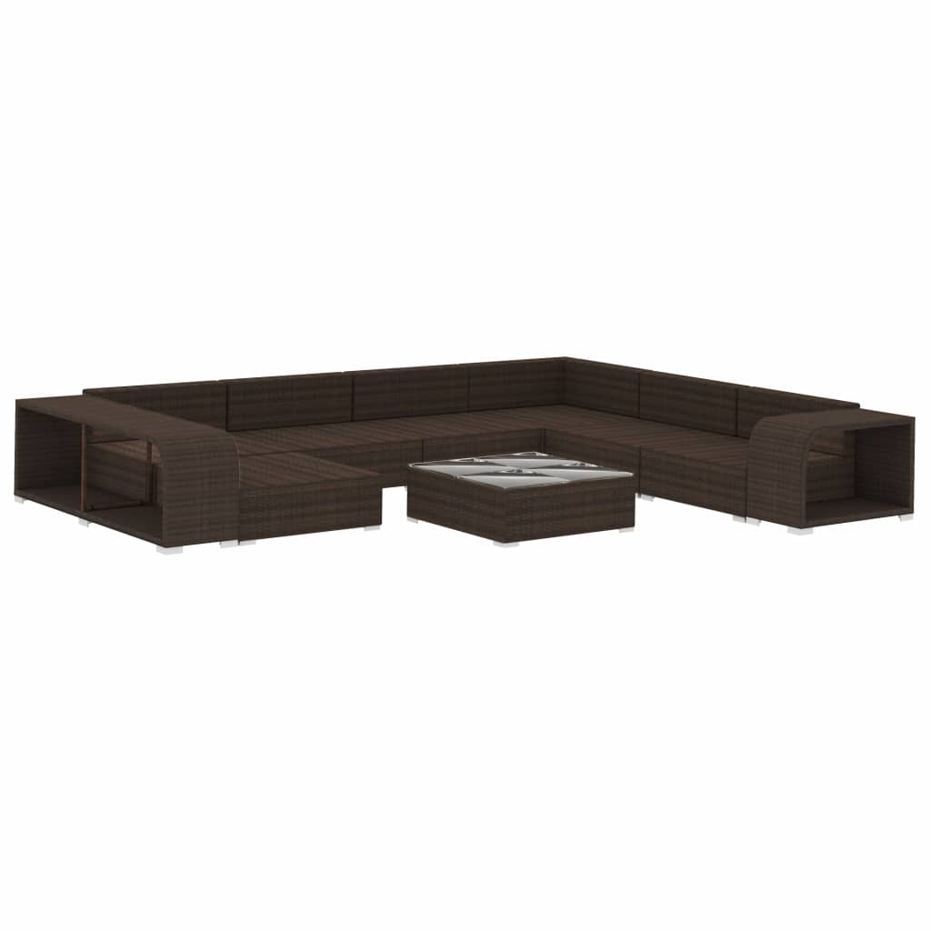 Schaffen Sie mit dieser 10-teiligen Sofagarnitur einen fesselnden und entspannenden Lounge-Bereich, von dem Sie schon immer geträumt haben. Auf diesem modularen Lounge-Set können Sie einen entspannten, sonnigen Nachmittag oder Sommerabend mit Ihrer Familie und Ihren Freunden genießen! Das Set besteht aus 10 Teilen, sodass Sie nach Belieben verschiedene Anordnungen und Kombinationen auswählen können. Dieses Set besteht aus strapazierfähigem, handgewebtem PE-Rattan und pulverbeschichtetem Stahlgestell. Das Möbelset ist robust, stabil und witterungsbeständig. Dank des allwettertauglichen PE-Rattans ist das Lounge-Set pflegeleicht, strapazierfähig und alltagstauglich. Die dick gepolsterten Auflagen und die tiefen, modernen Sitzmöbel sorgen dafür, dass Sie sich jederzeit wunderbar entspannen können. Die Sitzpolsterbezüge mit Reißverschluss sind abnehmbar und somit einfach zu waschen. Das Set enthält 1 Couchtisch und 2 Beistelltische in zwei Größen, die Ihnen viel Platz für Ihre Getränke, Obstkörbe, Bücher, Zeitschriften usw. bieten. Sie können alles griffbereit halten. Die Kaffeetischplatte besteht aus 5 mm starkem, gehärtetem Glas, das sowohl stilvoll als auch leicht zu reinigen ist. Außerdem können Sie dieses Set dank seines leichten und modularen Designs sehr umstellen. Die Lieferung umfasst 1 Ecksofa, 5 Mittelsofas, 1 Ottomane, 1 Couchtisch mit Glasplatte, 1 kleiner Beistelltisch, 1 großer Beistelltisch, 7 Sitz- und 7 Rückenpolster. Hinweis: Wir empfehlen, die Rattan-Sitzgruppe bei Regen, Schnee und Frost abzudecken.