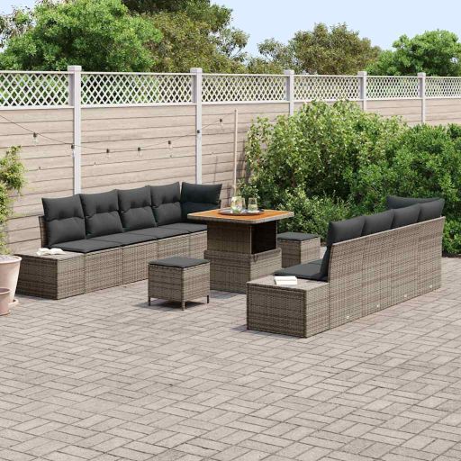 Dieses elfteilige Garten Sofa Set bringt modernen Stil in deinen Außenbereich und bietet gleichzeitig Komfort und Praktikabilität. Mit seinem eleganten grauen Design und den bequemen Kissen ist es perfekt für Zusammenkünfte oder einfach zum Entspannen im Garten oder auf der Terrasse. Platzsparendes Modulardesign: Das Design erlaubt verschiedene Anordnungen, egal ob für einen kleinen Balkon oder eine große Terrasse. Robuste Konstruktion: Aus solidem natürlichem Rattan und einem stabilen Metallrahmen gefertigt, ist dieses Set für die Langlebigkeit gebaut und trotzt dem Wetter. Ultimativer Komfort: Mit abnehmbaren Outdoor-Kissen aus wetterfestem Stoff, die dir tollen Sitzkomfort bieten, während du entspannst. Wenig Pflegeaufwand: Die Bezüge sind abnehmbar und waschbar, was die Reinigung leicht macht und sorgt dafür, dass du entspannt im Freien sitzen kannst. Perfekte Sitzkapazität: Platz für bis zu 6 Personen – ideal für Grillabende oder um mit der Familie ruhige Momente zu genießen.