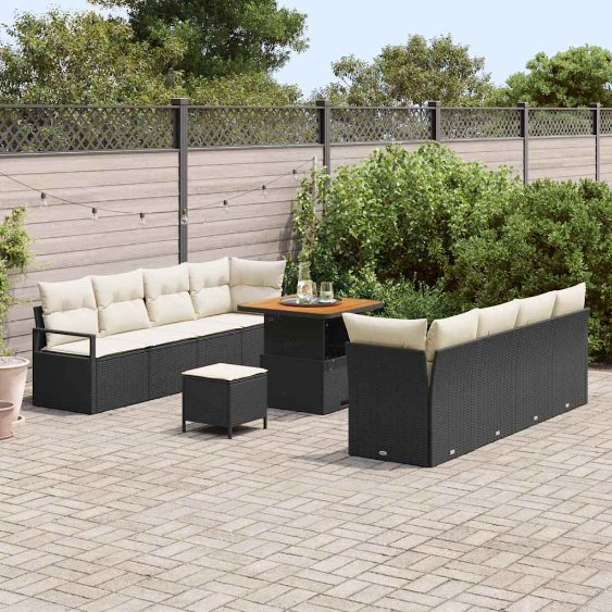 Dieses 11-teilige Garten-Sofa-Set gibt dir das perfekte Gefühl für das Sitzen draußen. Es kombiniert modernen Stil mit Komfort. Hergestellt aus hochwertigem Poly-Rattan und ausgestattet mit bequemen Creme-Kissen, ist es der beste Ort für gesellige Abende, gesprächige Stunden oder einfach zum Entspannen im Garten, auf dem Balkon oder auf der Terrasse. Stylisches Aussehen: Der coole Look von diesem Garten-Sofaset macht deinen Außenbereich zum Hingucker. Der schwarze Rahmen und die cremigen Kissen harmonieren perfekt miteinander. Haltbare Materialien: Das Sofa-Set ist aus UV-beständigen Materialien gemacht und hält dem Wetter stand. So kannst du es viele Saisons lang nutzen. Vielseitige Sitzmöglichkeiten: Platz für bis zu vier Personen, ideal für eine gemütliche Zusammentreffen oder entspannte Mahlzeiten. Super für Balkone, Terrassen oder Gärten – es passt zu jedem Anlass. Einfache Pflege: Die Kissen haben Reißverschlüsse für leichtes Abnehmen und Reinigen, damit dein Set immer frisch und sauber bleibt. Komplett-Set: Mit dem rechteckigen Couchtisch und dem Ecksofa macht es Essen im Freien oder entspannte Nachmittage zu etwas Besonderem. Gestalte deinen Außenbereich zu einer stylischen Oase des Komforts.