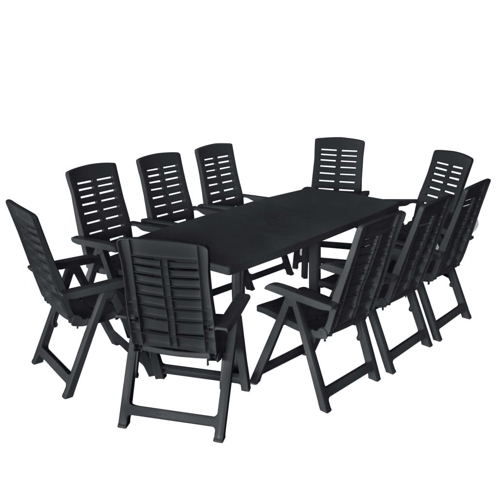 Unsere Garten-Essgruppe ist eine hervorragende Wahl für Mahlzeiten unter freiem Himmel - ob im Garten, auf der Terrasse oder dem Campingplatz. Die Garten-Essgruppe besteht aus strapazierfähigem Kunststoff, wodurch der Tisch und die Stühle wetterfest und leicht zu reinigen sind. Dieses Ess-Set aus Kunststoff ist außerdem leicht im Gewicht und daher einfach umher zu bewegen. Der Gartentisch verfügt über ein Sonnenschirmloch, sodass Sie ihn mit einem Sonnenschirm verwenden und Sie sich im Schatten abkühlen können. Die Rückenlehnen der Stühle lassen sich in 4 Positionen einstellen, so dass Sie immer die bequemste Position finden können. Die Stühle können bei Nichtgebrauch platzsparend zusammengeklappt werden. Die Lieferung beinhaltet 1 Tisch und 10 Klappstühle.