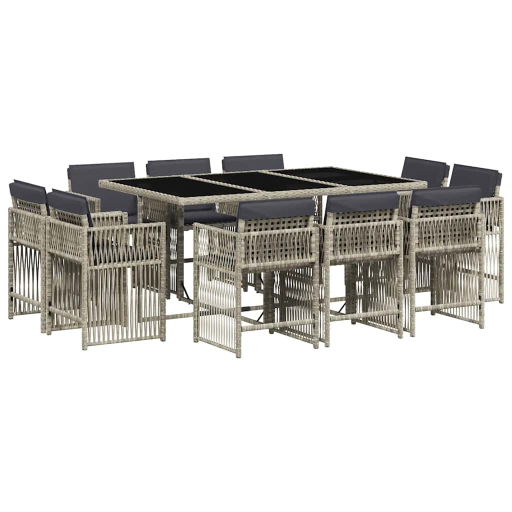 Diese Garten-Essgruppe ist eine ideale Wahl für Mahlzeiten im Freien oder einfach nur zum Entspannen im Garten, Hinterhof oder auf der Terrasse. Langlebiges Material: PE-Rattan, auch als Poly Rattan bekannt, ist ein robustes, pflegeleichtes synthetisches Material, das die Optik von natürlichem Rattan aufweist. Es kennzeichnet sich durch ein geringes Eigengewicht und lässt sich einfach reinigen. Aufgrund seiner Haltbarkeit und Witterungsbeständigkeit wird es häufig bei der Herstellung von Gartenmöbeln verwendet.Platzsparende Aufbewahrung: Dank der klappbaren Rückenlehnen lassen sich die Stühle unter dem Tisch verstauen, sodass die gesamte Essgruppe bei Nichtgebrauch eine platzsparende Würfelform bildet.Bequemes Sitzerlebnis: Dieser Gartensessel mit dick gepolsterten Kissen bietet ein angenehmes Sitzgefühl.Abnehmbarer und waschbarer Bezug: Die Sitzkissen verfügen über abnehmbare Bezüge, die sich ganz einfach waschen und reinigen lassen. Dank der Klappen an der Rückseite können die Kissen ganz einfach an den Rückenlehnen befestigt werden.Tischplatte aus Glas: Die Tischplatte des Gartentisches besteht aus starkem und langlebigem Hartglas, sodass sie leicht mit einem feuchten Tuch gereinigt werden kann und deinem Außenbereich einen Hauch von Eleganz verleiht. Gut zu wissen:Wir empfehlen dir, deine Gartenmöbel mit einer wasserdichten Hülle zu schützen, um lange Zeit eine ansprechende Optik aufzuweisen.