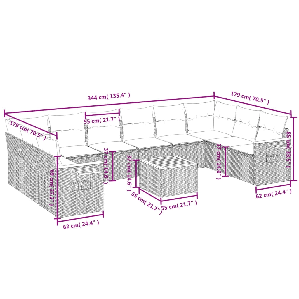 11-tlg. Garten-Sofagarnitur mit Kissen Grau Poly Rattan