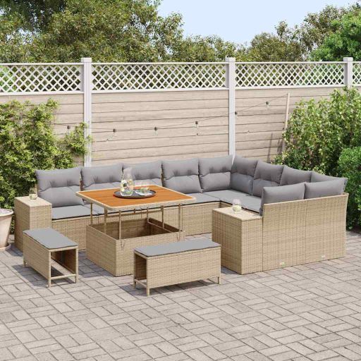 Mit diesem 12-teiligen Garten Sofa Set hebst du deine Outdoor-Treffen in Stil und Komfort auf ein neues Level. Das moderne Design ist sehr praktisch. Das schicke beige Poly Rattan passt perfekt zu den hellgrauen Kissen und macht aus jedem Patio, Balkon oder Garten einen tollen Außenbereich. Modulare Anordnung: Du kannst das Sofa auf verschiedene Arten aufstellen, um deinen Außenbereich anzupassen. Stelle es für Gäste auf oder entspanne einfach alleine. Bequeme Kissen: Die Kissen sind schön weich mit Reißverschlüssen für einfache Reinigung, sodass du auch nach stundenlanger Nutzung bequem bleibst. Der wetterfeste Stoff eignet sich perfekt fürs Draußensein. Robuste Konstruktion: Hergestellt aus UV-beständigen Materialien, hält das Poly Rattan und der stabile Rahmen allen Wetterbedingungen stand und sieht das ganze Jahr über toll aus. Komfort für alle: Mit Platz für 5 ist dieses Sofa Set perfekt für gesellige Zusammenkünfte, dann kannst du und deine Freunde bequem relaxen. Der große Platz macht es leicht, sich zu unterhalten. Einfacher Zusammenbau: Der Aufbau geht schnell – nur ein Schraubendreher und ein Schraubenschlüssel sind nötig. Richte deine neuen Gartenmöbel fix ein und genieße deinen Außenbereich.