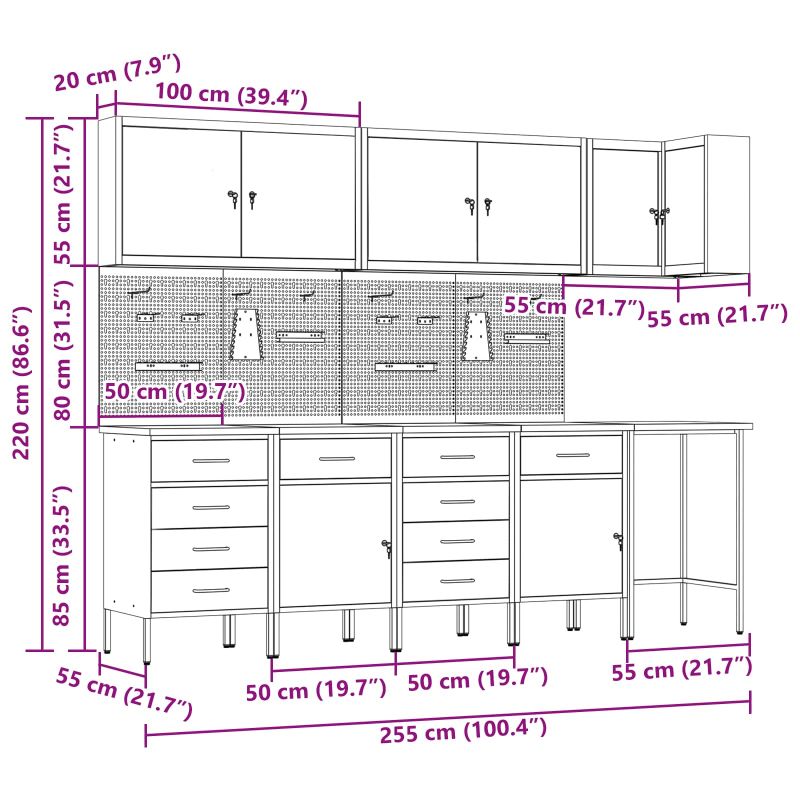 - Lieferumfang: Tisch, 7x Schrank, 4x Lochplatte
