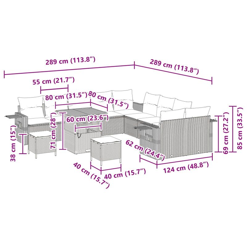 Mit dem 13-teiligen Garten Sofa Set hast du die perfekte bequeme Sitzgelegenheit für Outdoor-Partys. Das stilvolle schwarze Poly-Rattan und die weichen Kissen bringen Eleganz und machen deine Terrasse, deinen Balkon oder Garten zum perfekten Ort zum Entspannen. Umfangreiche Sitzkapazität: Platz für bis zu acht Personen - super für größere Zusammenkünfte. Handgewebtes Design: Hochwertige Handwebung für einen tollen Look und ein angenehmes Gefühl. Haltbar und Stilvoll: Poly-Rattan und Polyester sehen gut aus und sind gleichzeitig wetterfest. Einfache Pflege: Die Kissen haben Reißverschlüsse, die die Reinigung einfach machen. Vielseitige Anordnung: Teile umstellen und deinen Außenbereich individuell gestalten.