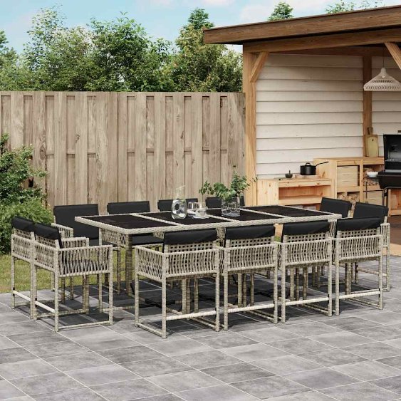Diese Garten-Essgruppe ist eine ideale Wahl für Mahlzeiten im Freien oder einfach nur zum Entspannen im Garten, Hinterhof oder auf der Terrasse. Langlebiges Material: PE-Rattan, auch als Poly Rattan bekannt, ist ein robustes, pflegeleichtes synthetisches Material, das die Optik von natürlichem Rattan aufweist. Es kennzeichnet sich durch ein geringes Eigengewicht und lässt sich einfach reinigen. Aufgrund seiner Haltbarkeit und Witterungsbeständigkeit wird es häufig bei der Herstellung von Gartenmöbeln verwendet.Platzsparende Aufbewahrung: Dank der klappbaren Rückenlehnen lassen sich die Stühle unter dem Tisch verstauen, sodass die gesamte Essgruppe bei Nichtgebrauch eine platzsparende Würfelform bildet.Bequemes Sitzerlebnis: Dieser Gartensessel mit dick gepolsterten Kissen bietet ein angenehmes Sitzgefühl.Abnehmbarer und waschbarer Bezug: Die Sitzkissen verfügen über abnehmbare Bezüge, die sich ganz einfach waschen und reinigen lassen. Dank der Klappen an der Rückseite können die Kissen ganz einfach an den Rückenlehnen befestigt werden.Tischplatte aus Glas: Die Tischplatte des Gartentisches besteht aus starkem und langlebigem Hartglas, sodass sie leicht mit einem feuchten Tuch gereinigt werden kann und deinem Außenbereich einen Hauch von Eleganz verleiht. Gut zu wissen:Wir empfehlen dir, deine Gartenmöbel mit einer wasserdichten Hülle zu schützen, um lange Zeit eine ansprechende Optik aufzuweisen.