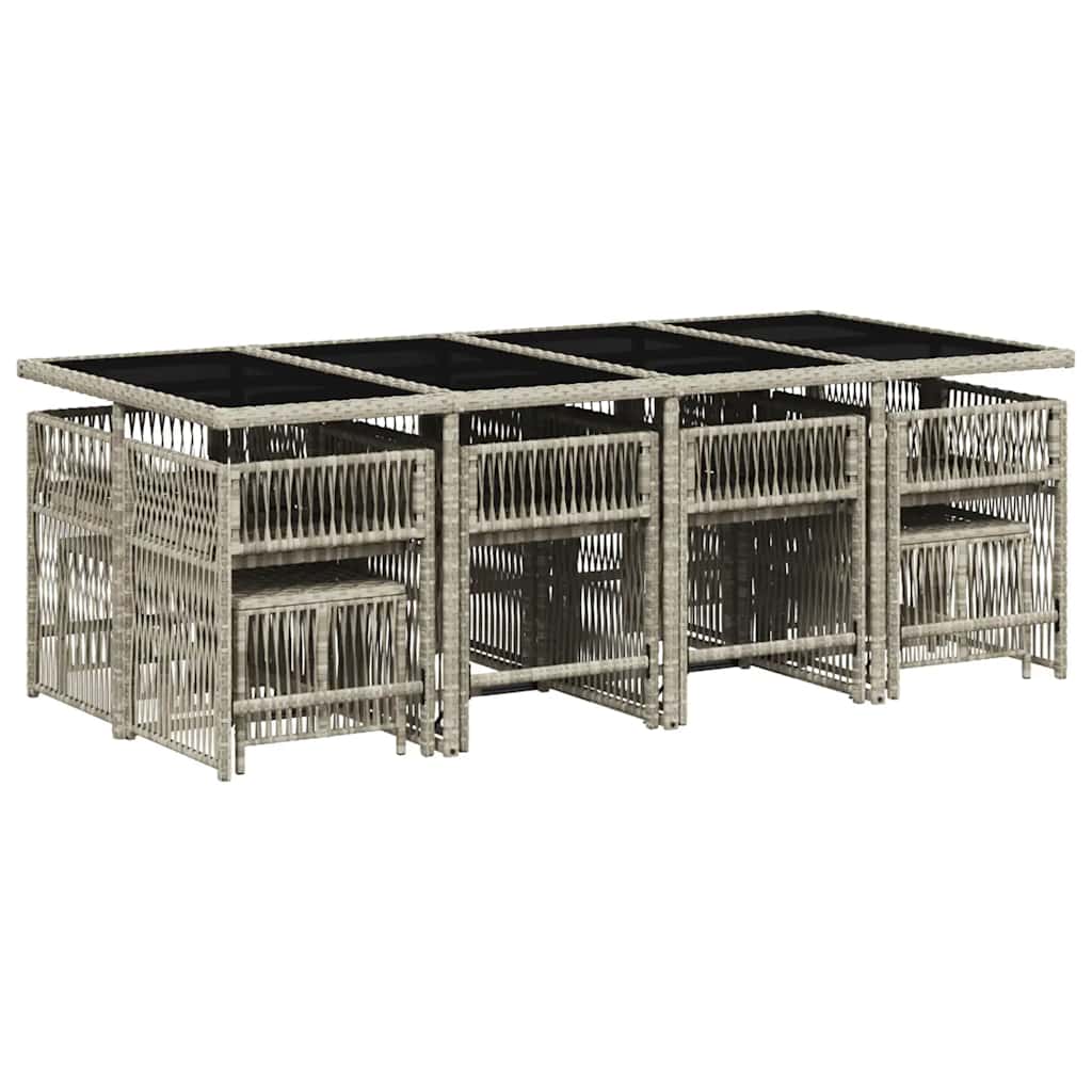 Diese Garten-Essgruppe ist eine ideale Wahl für Mahlzeiten im Freien oder einfach nur zum Entspannen im Garten, Hinterhof oder auf der Terrasse. Langlebiges Material: PE-Rattan, auch als Poly Rattan bekannt, ist ein robustes, pflegeleichtes synthetisches Material, das die Optik von natürlichem Rattan aufweist. Es kennzeichnet sich durch ein geringes Eigengewicht und lässt sich einfach reinigen. Aufgrund seiner Haltbarkeit und Witterungsbeständigkeit wird es häufig bei der Herstellung von Gartenmöbeln verwendet.Platzsparende Aufbewahrung: Dank der klappbaren Rückenlehnen lassen sich die Stühle unter dem Tisch verstauen, sodass die gesamte Essgruppe bei Nichtgebrauch eine platzsparende Würfelform bildet.Bequemes Sitzerlebnis: Dieser Gartensessel mit dick gepolsterten Kissen bietet ein angenehmes Sitzgefühl.Abnehmbarer und waschbarer Bezug: Die Sitzkissen verfügen über abnehmbare Bezüge, die sich ganz einfach waschen und reinigen lassen. Dank der Klappen an der Rückseite können die Kissen ganz einfach an den Rückenlehnen befestigt werden.Tischplatte aus Glas: Die Tischplatte des Gartentisches besteht aus starkem und langlebigem Hartglas, sodass sie leicht mit einem feuchten Tuch gereinigt werden kann und deinem Außenbereich einen Hauch von Eleganz verleiht. Gut zu wissen:Wir empfehlen dir, deine Gartenmöbel mit einer wasserdichten Hülle zu schützen, um lange Zeit eine ansprechende Optik aufzuweisen.