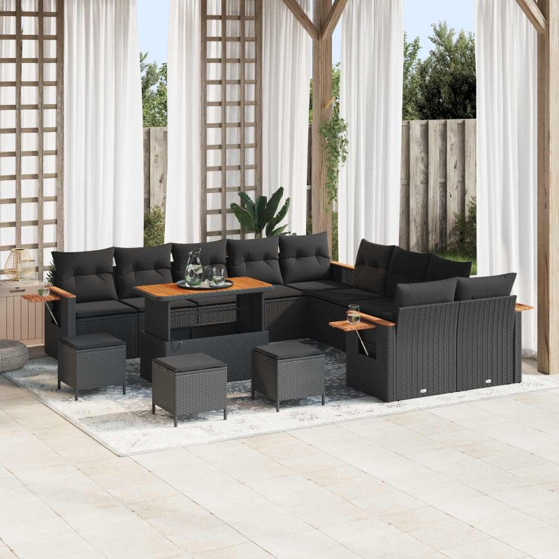14-teiliges Garten Sofa Set mit Kissen Schwarz Poly Rattan Akazie