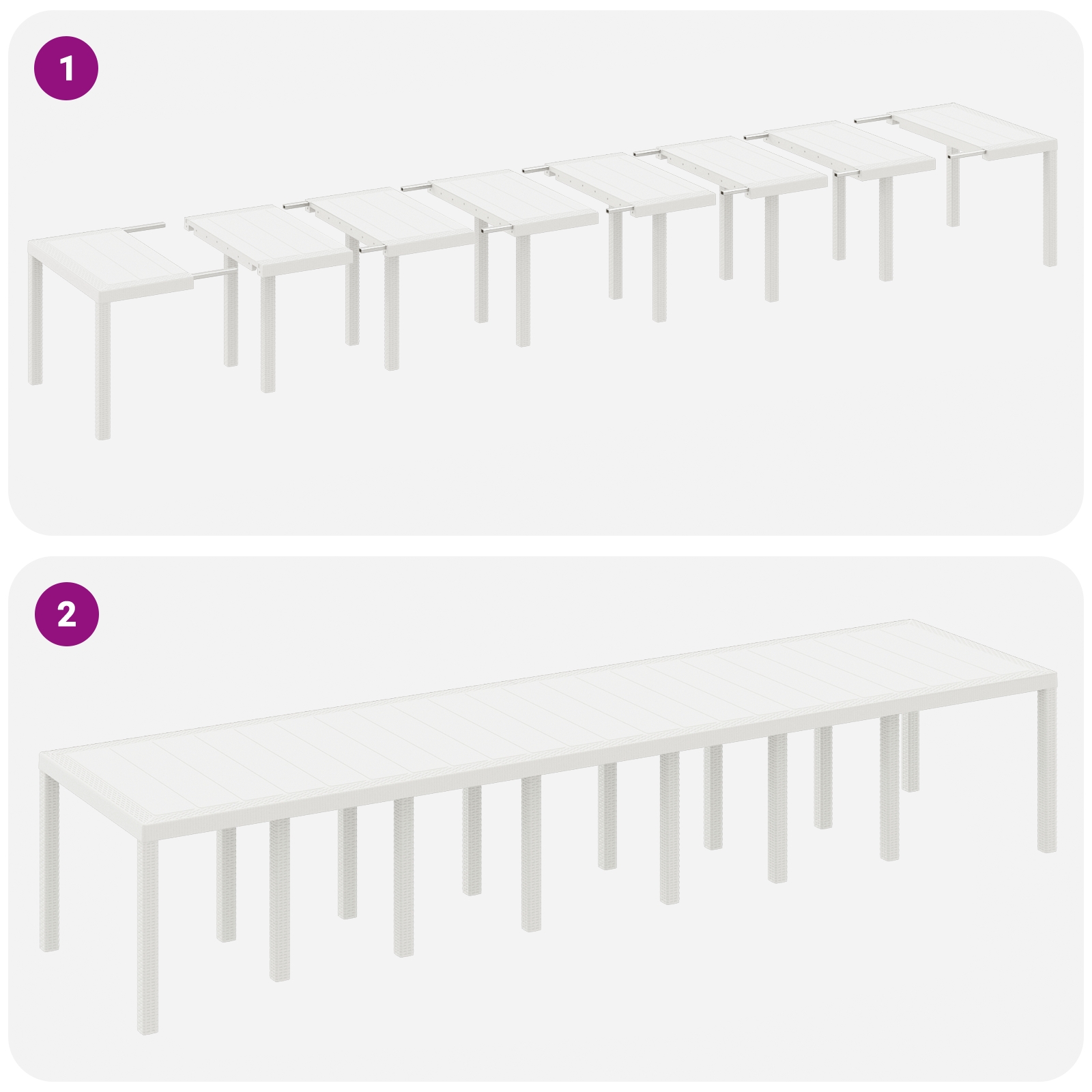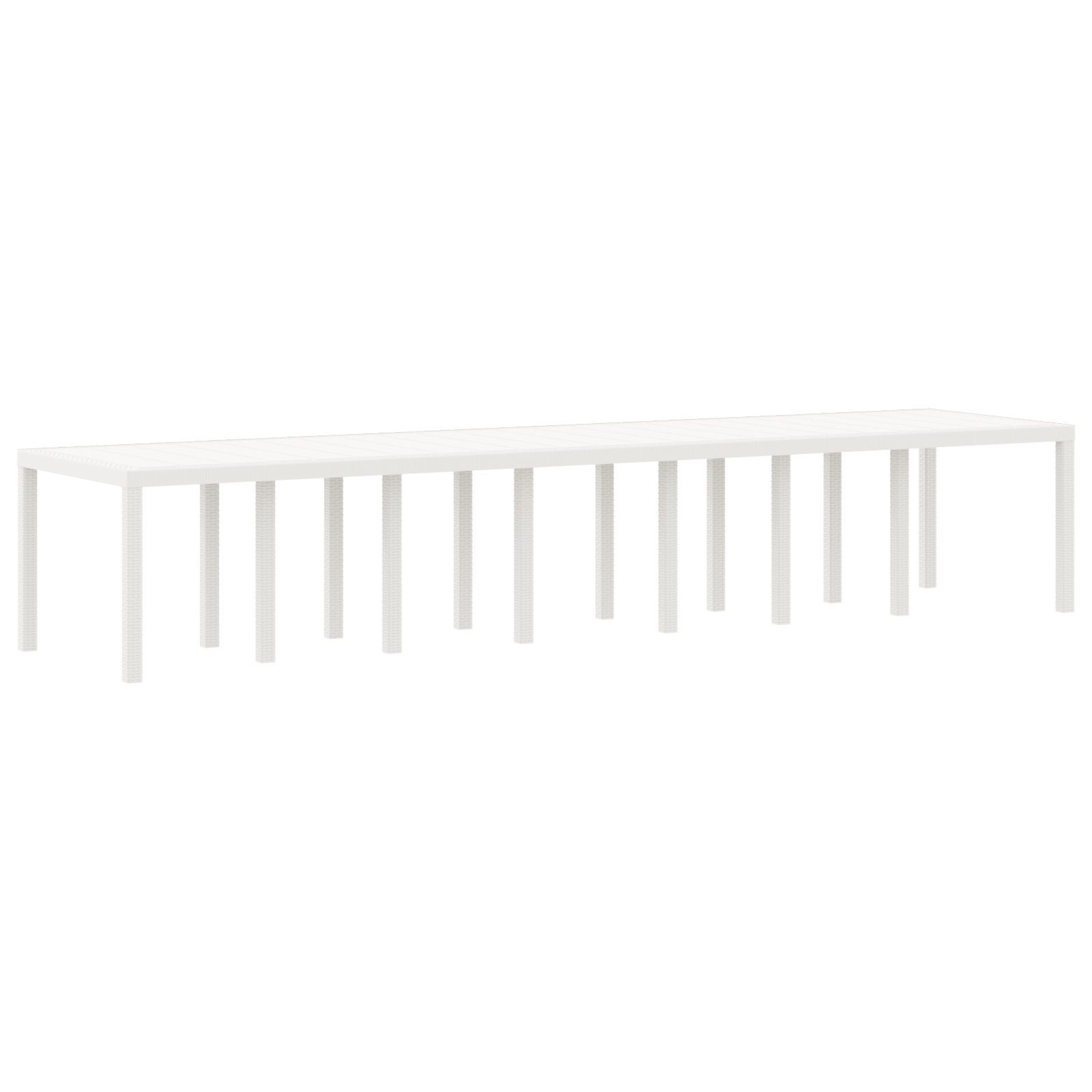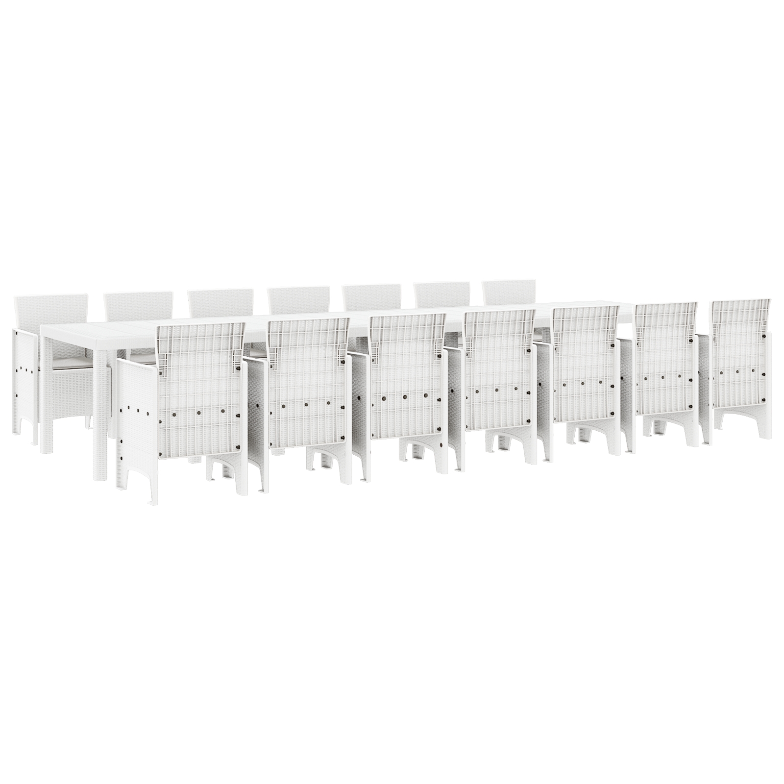 Dieses Garten-Esszimmer-Set bringt Stil und Funktionalität zusammen. Es besteht aus einem eleganten rechteckigen Tisch und 14 bequemen Stühlen in frischem Weiß, perfekt für gesellige Runden und Essen im Freien. Mit seinem modernen Look setzt es Akzente auf jedem Balkon oder jeder Terrasse und ist ideal für Familienessen oder ein Treffen mit Freunden im Freien. Große Sitzkapazität: Bietet Platz für bis zu 14 Personen – perfekt für Grillpartys, Geburtstagsfeiern oder entspannte Abendessen. Jeder hat genug Platz, um bequem zu sitzen und am Gespräch teilzunehmen. UV-beständige Materialien: Aus hochwertigen synthetischen Materialen gefertigt, hält dieses Set UV-Strahlen stand und behält seine leuchtenden Farben – auch bei starker Sonneneinstrahlung. Langlebig genug, damit du viele Jahre Freude daran hast. Modernes Design: Klare Linien und ein glattes Finish geben ihm einen stilvollen Look, der in jeden Außenbereich passt. Dieses Set ergänzt verschiedene Stile, von minimalistisch bis klassisch, und trägt zur Gesamtstimmung bei. Wartungsarm: Dank der glatten Oberflächen ist die Reinigung kinderleicht – einfach schnell mit einem feuchten Tuch abwischen. Außerdem ist es wetterfest, wodurch du keine Bedenken haben musst, es draußen stehen zu lassen. Geeignet für verschiedene Anlässe: Mit 350 cm Länge und 100 cm Breite ist der Tisch ideal für gemütliche Familienessen oder große Zusammenkünfte. Die perfekte Größe für dein Unterhaltungsbereich im Freien.