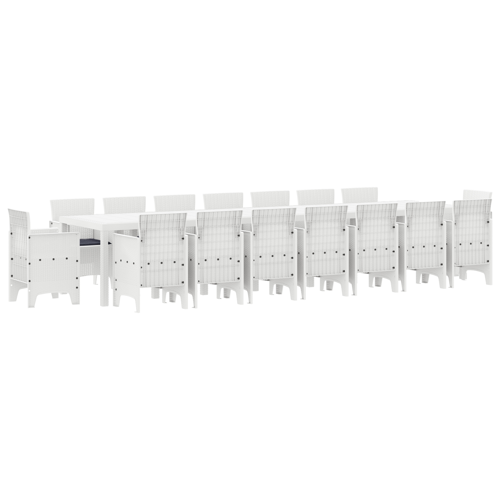 Dieses Gartentischset kombiniert modernen Stil mit Funktionalität. Es hat einen geräumigen rechteckigen Tisch und 16 bequeme Stühle, ideal für große Zusammenkünfte und Mahlzeiten im Freien. Die schlichte weiße Oberfläche ist perfekt für jedes Terrasse oder Veranda und toll für Essen mit der Familie oder gemütliche Zusammenkünfte draußen. Große Sitzkapazität: Für bis zu 16 Personen. Ideal für Grillpartys, Feiern oder gemütliche Abendessen. Es gibt genug Platz für alle, um gemeinsam zu essen und zu plaudern. UV-beständige Materialien: Aus hochwertigen synthetischen Materialien gefertigt, trotzt dieses Set UV-Strahlen und bleibt bei Sonnenlicht schön. Es ist langlebig und wird dir über viele Saisons Freude bereiten. Moderne Ästhetik: Klare Linien und ein schönes Finish geben ihm ein modernes Aussehen, das jedem Außenbereich einen stilvollen Touch verleiht. Passt zu verschiedenen Einrichtungsstilen. Niedriger Pflegeaufwand: Die pflegeleichten Poly-Rattan-Oberflächen sind einfach zu reinigen; einfach mit einem feuchten Tuch abwischen. Wetterfest, somit musst du dir keine Sorgen um die Lagerung machen, wenn sich das Wetter ändert. Vielseitige Größe: Diese großzügigen Abmessungen eignen sich sowohl für intime Abendessen als auch große Zusammenkünfte. Macht den Tisch zu einem flexiblen Mittelpunkt für deinen Außenbereich.