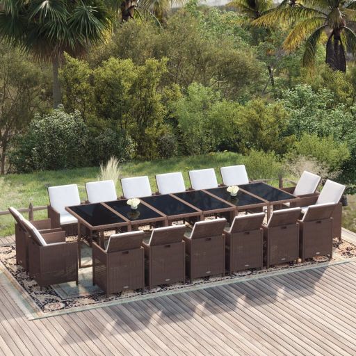 Diese Garten-Essgruppe aus Poly Rattan mit ihrem eleganten und einzigartigen Design ist eine großartige Wahl für Mahlzeiten und Entspannen im Outdoor-Wohnbereich. Praktisches Material: Das witterungsbeständige PE-Rattan ist pflegeleicht und strapazierfähig und sorgt für jahrelangen Dienst.Stabile und robuste Struktur: Die Stahlgestelle des Gartentisches und der Stühle sorgen für Robustheit und Stabilität.Flexible Stühle: Du kannst die Rückenlehnen umklappen und die Outdoor-Stühle unter dem Tisch verstauen. So sparst du wertvollen Stauraum, wenn das Set nicht in Gebrauch ist. Dank ihrer Leichtbauweise lassen sich alle Artikel leicht umstellen.Komfortables Erlebnis: Die dicken, weichen, mit Schaumstoff gefüllten Sitz- und Rückenkissen sorgen für zusätzlichen Sitzkomfort. Hinweis:Um die Lebensdauer deiner Gartenmöbel zu verlängern, empfehlen wir dir, sie mit einer wasserdichten Hülle zu schützen.