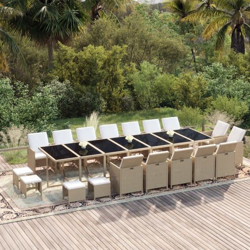 Diese Garten-Essgruppe aus Poly Rattan mit ihrem eleganten und einzigartigen Design ist eine großartige Wahl für Mahlzeiten und Entspannen im Outdoor-Wohnbereich. Praktisches Material: Das witterungsbeständige PE-Rattan ist pflegeleicht und strapazierfähig und sorgt für jahrelangen Dienst.Stabile und robuste Struktur: Die Stahlgestelle des Gartentisches und der Stühle sorgen für Robustheit und Stabilität.Flexible Stühle: Du kannst die Rückenlehnen umklappen und die Outdoor-Stühle unter dem Tisch verstauen. So sparst du wertvollen Stauraum, wenn das Set nicht in Gebrauch ist. Dank ihrer Leichtbauweise lassen sich alle Artikel leicht umstellen.Komfortables Erlebnis: Die dicken, weichen, mit Schaumstoff gefüllten Sitz- und Rückenkissen sorgen für zusätzlichen Sitzkomfort. Hinweis:Um die Lebensdauer deiner Gartenmöbel zu verlängern, empfehlen wir dir, sie mit einer wasserdichten Hülle zu schützen.
