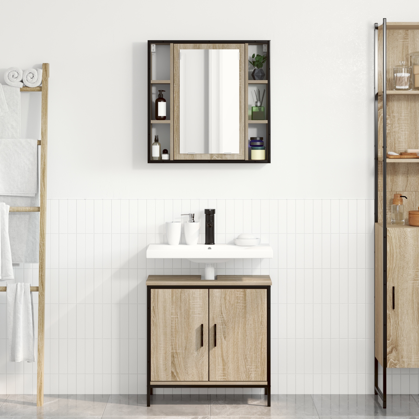 Dieses Badezimmermöbelset kombiniert Praktikabilität mit Stil. Der Waschtisch und der wandmontierte Spiegel sind perfekt für Makeup und Pflege und verleihen deinem Badezimmer mit der schicken Sonoma-Eiche-Oberfläche und viel Stauraum einen modernen Flair. Viel Stauraum: Die Einheit bietet zahlreiche Fächer für deine Badezimmerutensilien, perfekt für beschäftigte Haushalte. Stylisches Design: Mit einer modernen Ästhetik passt dieses Möbelset wunderbar zu verschiedenen Dekorationsstilen. Das Sonoma-Eiche-Finish schafft eine warme Atmosphäre und macht dein Badezimmer schick. Robustes Material: Hergestellt aus Holzwerkstoff und Metall, ist dieses Set stabil und für die Ewigkeit gemacht. Die glatte Haptik und die matte Oberfläche verbessern das Gesamtbild. Wandspiegel: Der Spiegel setzt einen modernen Akzent und hilft dir, Platz zu sparen – perfekt für kleinere Badezimmer. So bleibt alles ordentlich, während du dich problemlos pflegen kannst. Einfache Montage: Schnell zusammengebaut, damit du dein Badezimmer ohne viel Aufwand einrichten kannst. Mit nur wenigen Werkzeugen kannst du dein neues Möbelstück im Handumdrehen genießen.