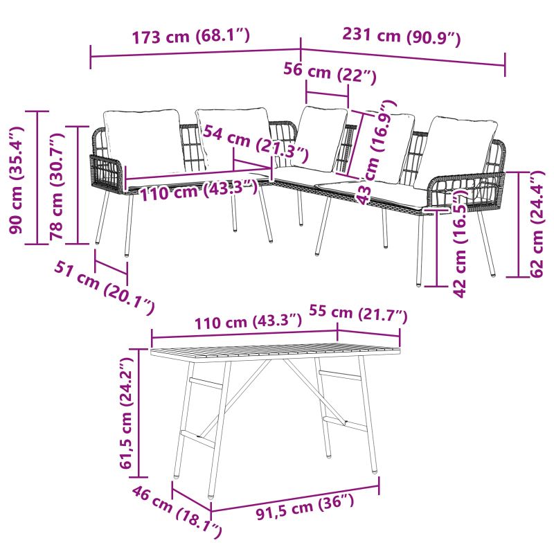 Dieses Garten Sofa Set vereint Stil und Komfort und ist eine super Wahl für Außenbereiche. Sein schlankes Design und die flexible Anordnung passen perfekt auf Balkone, Terrassen oder in Wintergärten und bieten viel Platz für Entspannung oder gesellige Zusammenkünfte. Robuste Bauweise: Das Garten Sofa Set besteht aus hochwertigen Materialien und sorgt dafür, dass es draußen hält. Mit einem stabilen Stahlrahmen und bequemen synthetischen Poly-Rattan-Sitzgelegenheiten sieht es stylisch aus. UV-Beständigkeit: Dank UV-beständiger Materialien behält dieses Möbelstück auch nach starker Sonneneinstrahlung sein tolles Aussehen. Perfekt für sonnige Plätze, es wird nicht verblassen oder abnutzen. Modernes Design: Der schicke, moderne Look mit matter Oberfläche wertet jeden Bereich auf und ist ein eleganter Bestandteil deines Außenbereichs. Seine klaren Linien und stylischen Formen werden deine Gäste sicher beeindrucken. Komfort: Jeder Sitz hat weiche Polyesterkissen für extra Komfort. Diese Kissen sind perfekt zum Entspannen und machen das Loungen im Freien ganz einfach. Einfacher Pflege: Dieses Set ist leicht zu reinigen; einfach mit einem feuchten Tuch abwischen. So bleibt mehr Zeit, um deinen Außenbereich zu genießen.