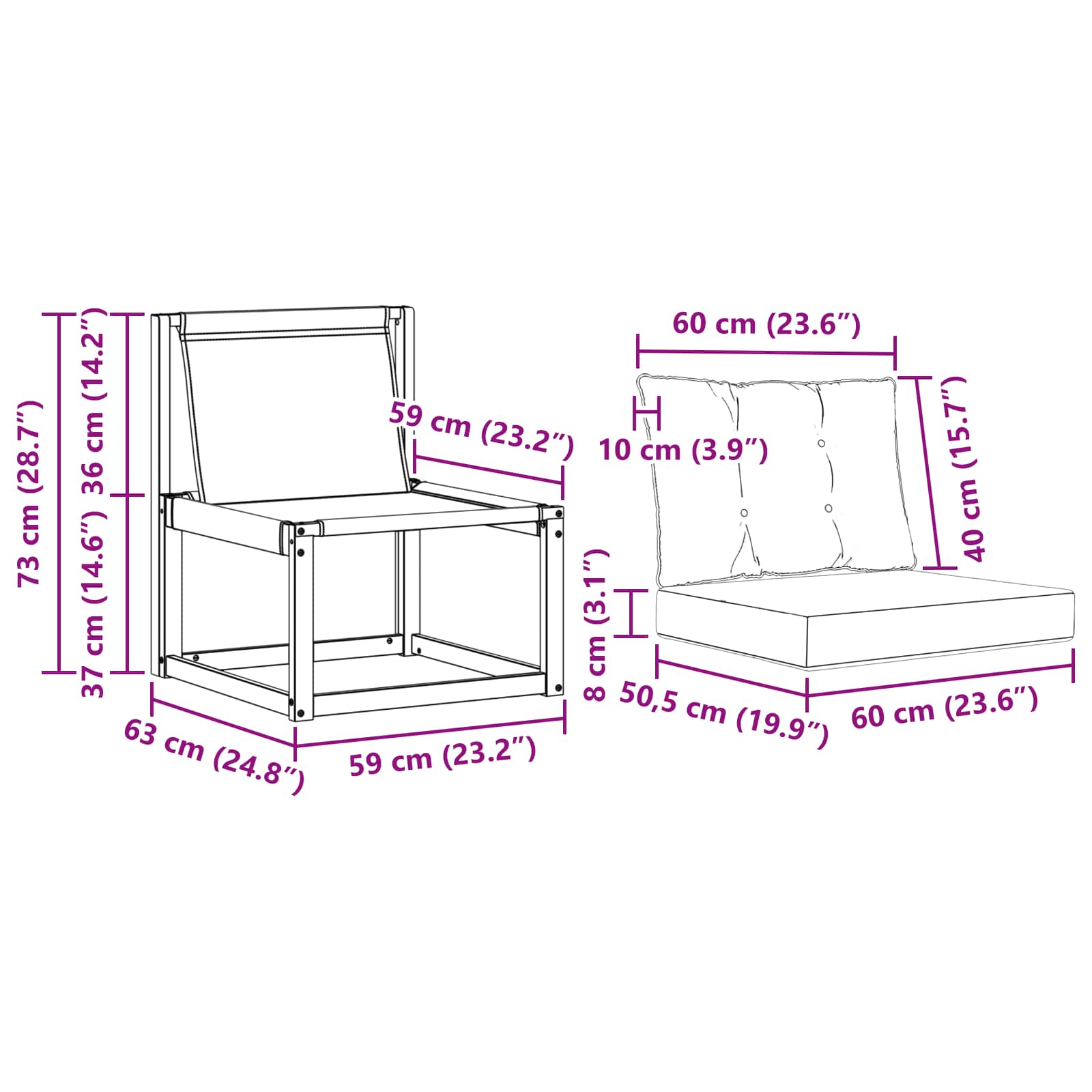 - 3 x Sitzkissen: 60 x 50,5 x 8 cm (LxBxH)