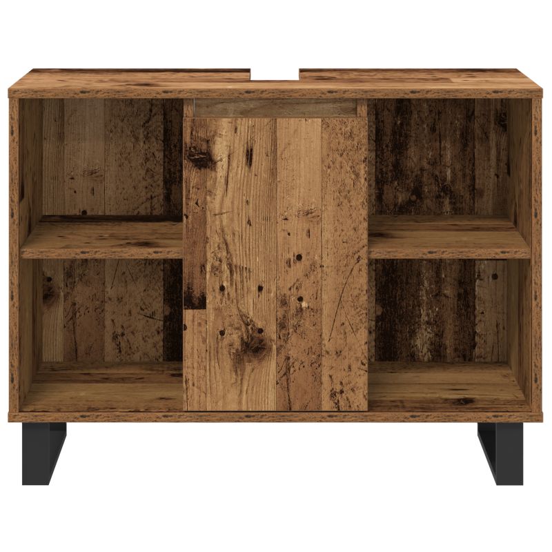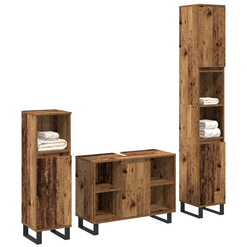 Dieses Badezimmermöbel Set besteht aus drei stylischen Teilen mit einem rustikalen Finish aus altem Holz. Es kombiniert perfekt Stil und Funktion für jedes moderne Badezimmer. Der frische Look verbessert die Atmosphäre und bietet viel Platz, um deine Artikel ordentlich unterzubringen. Eine tolle Wahl, um deinen Raum sauber zu halten. Modernes Design: Das Finish aus altem Holz und der matte schwarze Rahmen sorgen für einen stylischen Look, der dein Badezimmer aufwertet. Geräumige Aufbewahrung: 14 Fächer mit verstellbaren Regalen und Türen machen den Zugriff auf deine Essentials super einfach! Hochwertige Verarbeitung: Aus Spanplatte und Metall gefertigt, ist dieses Set langlebig und für den langfristigen Gebrauch geeignet. Vielseitig nutzbar: Passt gut in große und kleine Badezimmer und ist für verschiedene Zwecke geeignet. Einfach zu reinigen: Einfach mit einem trockenen Tuch abwischen, und schon sieht es aus wie neu!