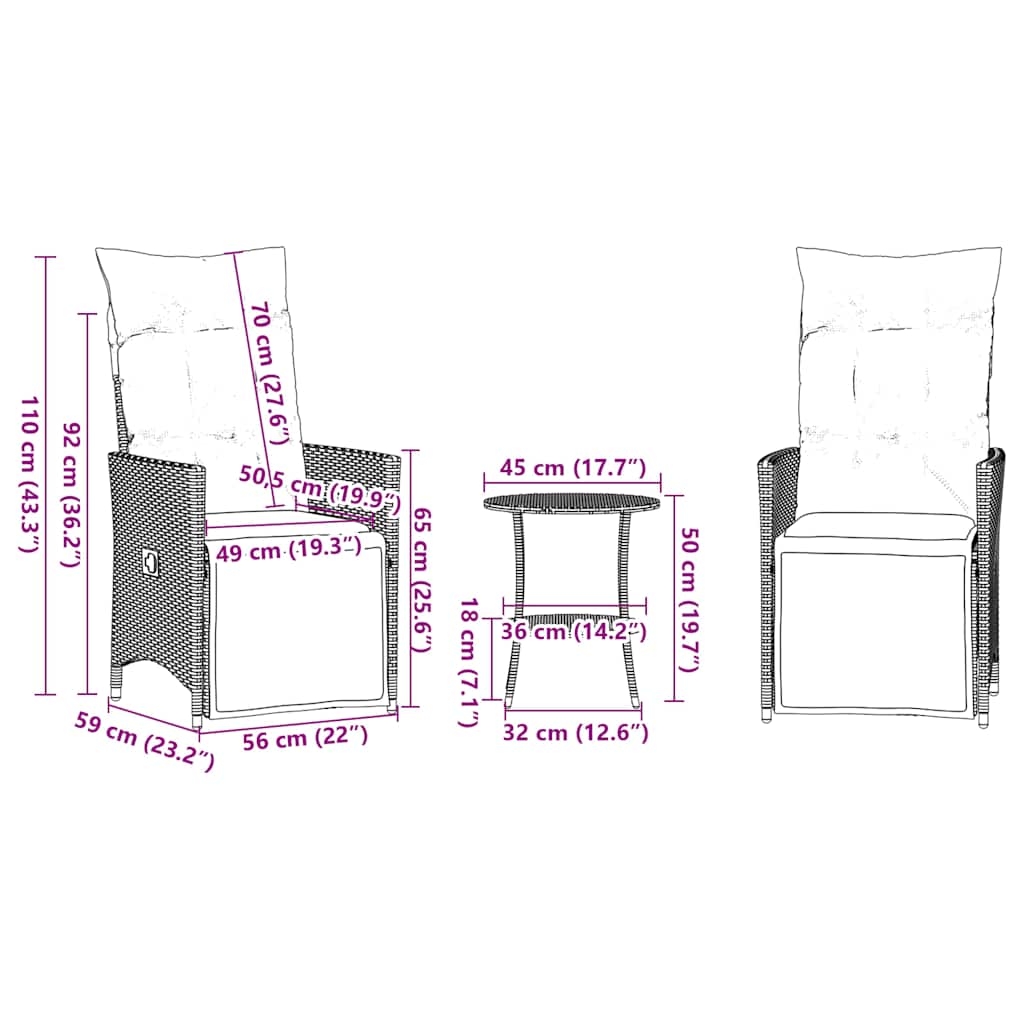 Genießen Sie einen Kaffee oder unterhalten Sie sich mit Ihrer Familie und Freunden im Garten, Hinterhof oder auf dem Balkon mit diesem bequemen Bistro-Set! Langlebiges Material: PE-Rattan, auch bekannt als Polyrattan, ist ein robustes, pflegeleichtes Kunststoffmaterial, das natürlichem Rattan ähnelt. Es ist leicht, einfach zu reinigen und wird aufgrund seiner Langlebigkeit und Wetterbeständigkeit häufig für Gartenmöbel verwendet. Verstellbare Rückenlehne und Fußstütze: Dieser Gartensitz verfügt über einen Griff. Durch Ziehen am Griff können Sie Rückenlehne und Fußstütze in jede beliebige Position bringen. Mit dem Griff können Sie Rückenlehne und Fußstütze auch schnell wieder in die Ausgangsposition zurückbringen. Bequemes Sitzerlebnis: Dieses Gartenmöbel-Set mit dick gepolsterten Kissen bietet ein bequemes Sitzerlebnis. Abnehmbarer und waschbarer Bezug: Diese Sitzkissen verfügen über abnehmbare Bezüge für einfaches Waschen und Pflegen. Die Rückenpolster verfügen über eine Lasche an der Rückseite zur einfachen Befestigung an den Rückenlehnen.Robuster und stabiler Rahmen: Der pulverbeschichtete Stahlrahmen sorgt dafür, dass die Gartenmöbel robust und stabil für den täglichen Einsatz im Freien sind. Gut zu wissen:Damit Ihre Gartenmöbel lange schön bleiben, empfehlen wir Ihnen, sie mit einer wasserdichten Schutzhülle zu schützen.
