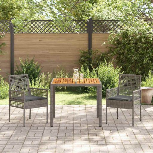 Dieses Essset für den Außenbereich in Grau ist eine super Wahl für deinen Balkon oder Garten. Es hat einen geräumigen quadratischen Tisch und zwei bequeme Stühle. Das schicke Design hebt jeden Außenbereich hervor und macht ihn zum perfekten Ort für Essen und entspannte Momente. u003culu003eu003cliu003eHaltbarkeit: Hergestellt aus hochwertigen Materialien wie wasserfestem Rattan und solidem Akazienholz kann dieses Outdoor-Set den Elementen standhalten und dabei schick aussehen.u003c/liu003eu003cliu003eStylisches modernes Design: Der schlanke Look kombiniert glattes Holz mit einem texturierten Rattan-Geflecht und macht es zu einer eleganten Wahl für den Außenbereich.u003c/liu003eu003cliu003eKomfort zuerst: Jeder Stuhl hat weiche, abnehmbare Kissen für zusätzlichen Komfort – perfekt für lange Gespräche oder Mahlzeiten im Freien.u003c/liu003eu003cliu003eVielseitig und funktional: Von romantischen Abendessen bis informellen Zusammenkünften, lässt sich dieses Set leicht von formell zu entspannt umwandeln.u003c/liu003eu003cliu003eEinfache Pflege: Oberflächenbehandlungen und abnehmbare Kissenbezüge machen die Reinigung kinderleicht, sodass dein Essset immer bereit ist, wenn du es möchtest.u003c/liu003eu003c/ulu003e