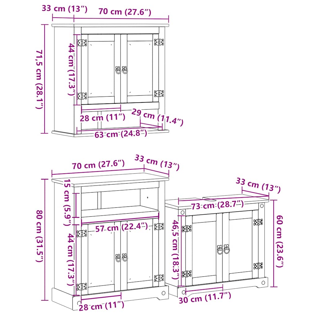Dieses Badmöbel-Set aus Holz ist eine hervorragende Bereicherung für dein Badezimmer und verleiht ihm eine aufgeräumte und markante Optik! Robust und stabil: Kiefernholz ist für seine Stärke und Haltbarkeit bekannt. Seine gerade Maserung und die charakteristischen Aststellen tragen zu seinem rustikalen Charme bei.Reichlich Stauraum: Dieses Badmöbel-Set bietet reichlich Stauraum, um wichtigste Toilettenartikel und Badutensilien wie Seife, Shampoo, Zahnpasta usw. aufzubewahren.Praktische Griffe: Der Schrank ist mit bequemen Griffen versehen, die das Öffnen und Schließen des Schranks erleichtern und gleichzeitig zu seiner ansprechenden Optik beitragen.Praktische Tür: Sorge für Ordnung in deinem Bad, indem du wichtige Kleinigkeiten in diesem Schrank hinter der Tür aufbewahrst.Pflegeleicht: Dank seiner glatten Oberfläche lässt sich der Badschrank mit einem feuchten Tuch leicht reinigen und erfordert wenig Pflege. Gut zu wissen:Schrauben und Dübel sind für die Befestigung an der Wand nicht im Lieferumfang enthalten. Wir empfehlen dir, speziell für deine Wände geeignete Schrauben und Dübel zu finden und zu verwenden. Im Zweifelsfall wende dich an einen Fachmann. Bitte lese und befolge jeden Schritt der Anweisungen. Achtung:Um ein Umkippen zu vermeiden, sollte dieses Produkt mit der mitgelieferten Wandhalterung gesichert werden.