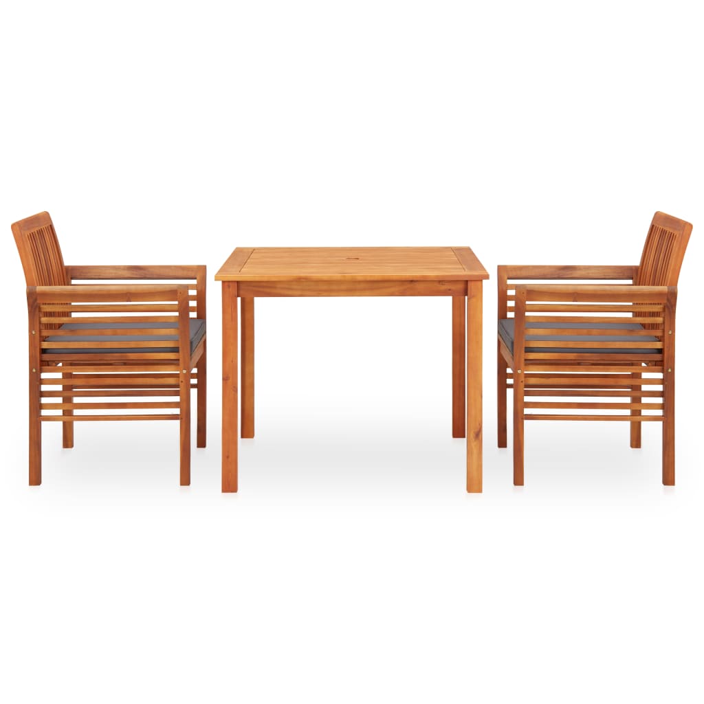 Verleihen Sie Ihrem Garten oder Hinterhof einen schönen natürlichen Look mit dieser schlichten und zugleich eleganten 3-teiligen Essgruppe. Hier können Sie unvergessliche Mahlzeiten im Freien mit geliebten Familienmitgliedern oder Freunden genießen! Der Tisch und die Stühle bestehen aus massivem, mit Öl behandeltem Akazienholz und weisen ein Lattendesign auf. Sie sind daher witterungsbeständig und für den Außenbereich bestens geeignet. Die geölte Oberfläche lässt sich außerdem einfach reinigen. Ausgestattet mit gemütlichen Schaumstoffpolstern, bietet Ihnen dieses Möbelset großen Komfort beim Entspannen im Freien. Bei Nichtgebrauch können Sie das Set abdecken oder lagern, damit Sie sich mehrere Jahre an diese Gartenmöbeln erfreuen können. Der Lieferumfang beinhaltet 1 Esstisch und 2 Essstühle.