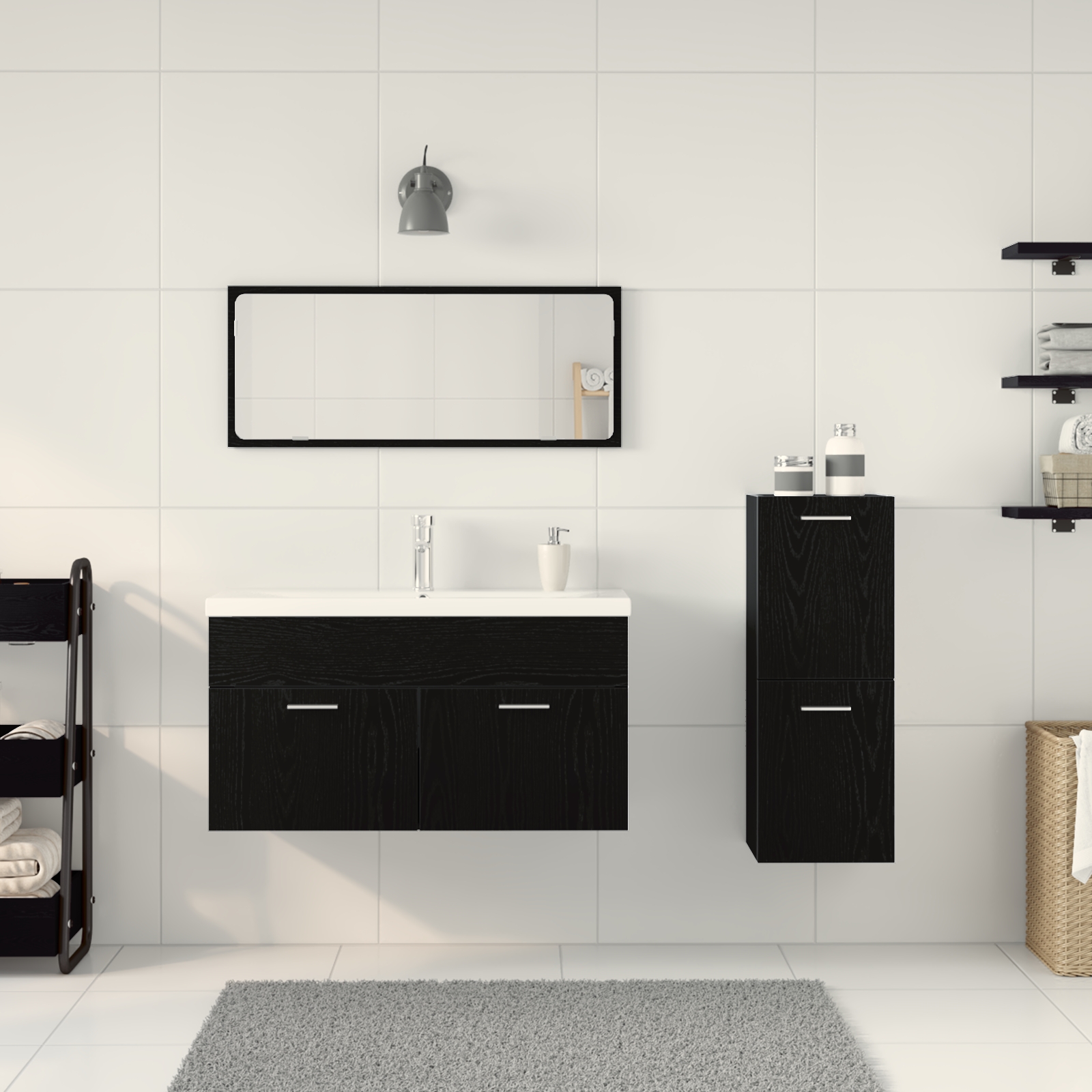 Dieses Badezimmermöbel-Set vereint Stil und Funktionalität und ist perfekt für moderne Räume. Mit dem schlanken Finish in schwarzer Eiche bekommst du ein geräumiges Waschbecken, einen Spiegel und zusätzliche Stauraumschränke, die dein Badezimmer aufwerten. Moderner Stil: Dieses Möbelset hat ein schlankes Design, das ideal für moderne Innenräume ist. Die klaren Linien schaffen eine stilvolle Atmosphäre, was es zu einer tollen Wahl für zeitgenössische Badezimmer macht. Viel Stauraum: Mit drei eingebauten Schränken und drei Schubladen hast du reichlich Platz für all deine Toilettenartikel. Sag dem Chaos Lebewohl und halte dein Badezimmer ordentlich! Robustes Material: Aus hochwertigem Holzwerkstoff gefertigt, ist dieses Set auf Langlebigkeit ausgelegt. Die glatte matte Oberfläche sorgt nicht nur für Robustheit, sondern erleichtert auch die Reinigung, sodass deine Möbel jahrelang frisch aussehen. Vielseitige Nutzung: Ideal für jeden Stil und Raum, egal ob du ein kleines Gäste-Badezimmer aufwertest oder dein Hauptbad renovierst – dieses Set passt überall. Eleganter Spiegel: Der enthaltene Spiegel ist nicht nur praktisch, sondern bringt auch Glamour. Seine Größe eignet sich, um deinen Raum zu vergrößern und bietet zusätzliche Funktionalität.