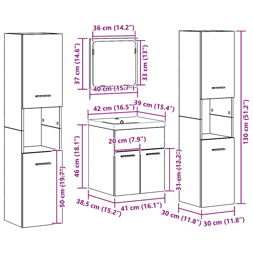 - Delivery Contains: Wooden bathroom furniture set including 1 mirror, 1 vanity sink cabinet, and 2 tall cabinets