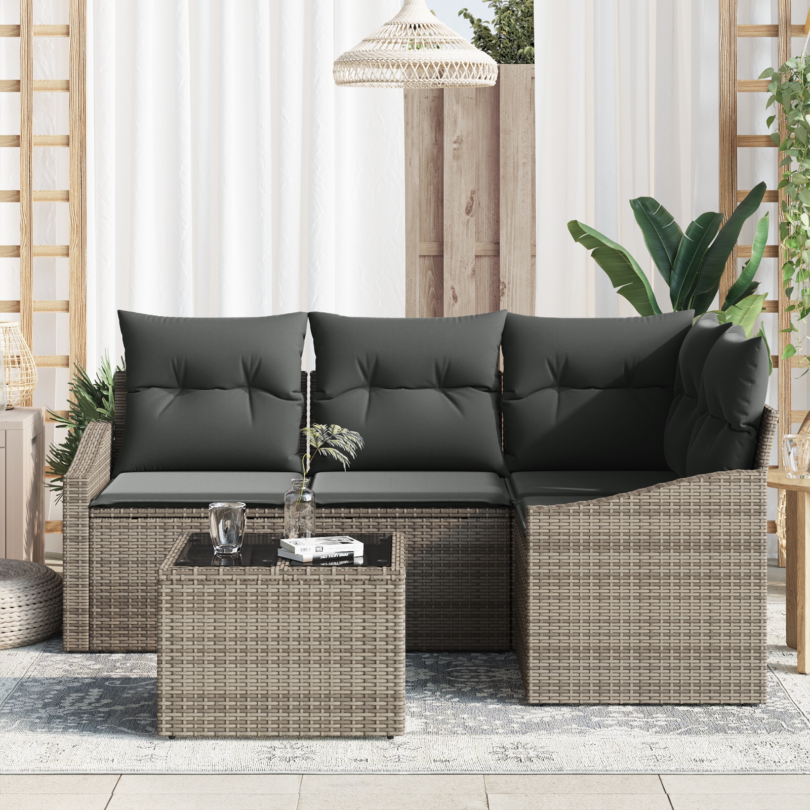 Dieses Outdoor Ecksofa Set verbindet Komfort mit Stil, verfügt über weiche graue Kissen und ein trendiges Design. Es passt perfekt auf Balkone oder in Gärten und bietet bequeme Sitzgelegenheiten für sonnige Treffen. Robuste Konstruktion: Hergestellt aus UV-beständigem natürlichem Rattan, ist dieses Garten Sofa Set langlebig und behält seine Schönheit und Funktionalität. Bequeme Kissen: Das Set kommt mit weichen grauen Kissen mit Reißverschlüssen, die Komfort und einfache Pflege kombinieren, sodass du stilvoll im Freien entspannen kannst. Modulares Design: Diese flexible Sofanordnung ermöglicht es dir, dein Setup nach Lust und Laune zu gestalten, sodass es perfekt in jeden Außenbereich passt, egal ob du Freunde einlädst oder einen ruhigen Abend alleine genießt. Chic Stil: Das moderne Design bringt einen Hauch von Raffinesse und hebt die Atmosphäre deines Gartens, schafft einen gemütlichen Ort für Familie und Freunde. Einfacher Aufbau: Mit einer klaren Anleitung kannst du dieses Sofa Set schnell zusammenbauen und deine Outdoor-Oase schnell genießen.