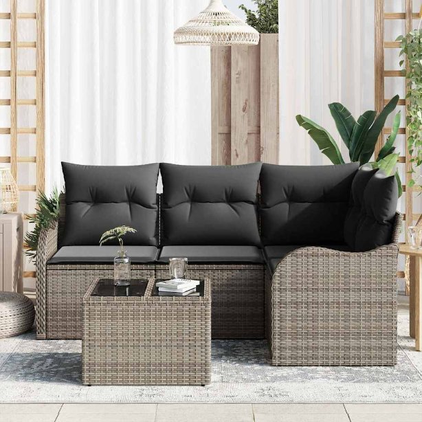 Dieses Outdoor Sektionals Sofa Set ist ideal für entspannte Zeiten in deinem Garten, perfekt für kleine Treffen oder lockere Mahlzeiten. Das hübsche graue Poly Rattan Finish verleiht ihm einen modernen Look, während die bequemen Kissen eine gemütliche Stimmung für Naturgenuss schaffen. Modulares Design: Das Sofa ist aus einzelnen Elementen, die du für flexible Sitzmöglichkeiten umstellen kannst. Ideal für jede Außenveranstaltung – perfekt für intime Mahlzeiten oder zum Chillen. Wetterfeste Materialien: Hergestellt aus stabilem Poly Rattan, widersteht dieses Sofa Set dem Wetter und bleibt das ganze Jahr über schick. Weiche und abnehmbare Kissen: Jedes Kissen ist mit Schaum gefüllt für den besten Komfort. Zudem sind sie in strapazierfähigem Polyesterstoff mit Reißverschlüssen eingepackt, die eine einfache Reinigung ermöglichen. Einfache Montage: Es besteht aus vier Teilen, die wirklich easy aufgebaut werden können. Du kannst es schnell mit nur zwei Personen aufstellen, sodass du dein neues Sofa im Handumdrehen genießen kannst. Stylisches und elegantes Design: Die Kombination aus strukturiertem grauem Rattan und weichen Kissen gibt ihm ein schickes Aussehen, das jeden Patio oder Balkon aufwertet.