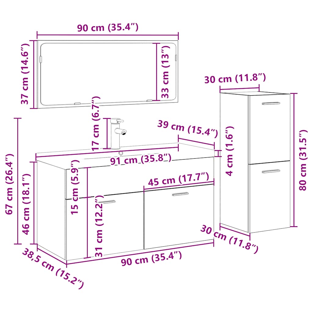 Dieses stilvolle Badmöbel-Set mit viel Stauraum ist eine ausgezeichnete Ergänzung für Ihr Badezimmer, denn es verleiht ihm ein aufgeräumtes und auffälliges Erscheinungsbild! Robustes Material: Der Unterschrank besteht aus Holzwerkstoff, einem Material von außergewöhnlicher Qualität mit glatter Oberfläche, das sich durch Festigkeit, Stabilität und Feuchtigkeitsbeständigkeit auszeichnet.Reichlich Stauraum: Das Waschbecken im Badezimmer bietet ausreichend Stauraum, um Gegenstände in Ihrem Badezimmer zu verstauen.Praktisches Design: Auf der Oberseite dieses Badschranks findet dein Waschbecken den idealen Platz.Wandmontage: Der Badezimmerschrank lässt sich an der Wand montieren, um zusätzlichen Stauraum zu schaffen. Auf diese Weise kannst du deine Stellfläche maximieren und leichter für Ordnung sorgen.Überlauffunktion: Ein Überlauf sorgt dafür, dass das Wasser abfließt, wenn das Waschbecken zu voll wird. Gut zu wissen:Schrauben und Dübel für die Wandbefestigung sind nicht enthalten. Suchen und verwenden Sie die für Ihre Wände geeigneten Schrauben und Dübel. Wenn Sie unsicher sind, suchen Sie professionelle Hilfe. Lesen und befolgen Sie jeden Schritt der Anleitung sorgfältig.Wasserhahn und Ablauf mit Überlauffunktion sind im Lieferumfang enthalten.Es handelt sich um eine Warm- und Kaltwasser-Armatur. Für Warmwasser ist der Anschluss eines Warmwasserbereiters erforderlich.