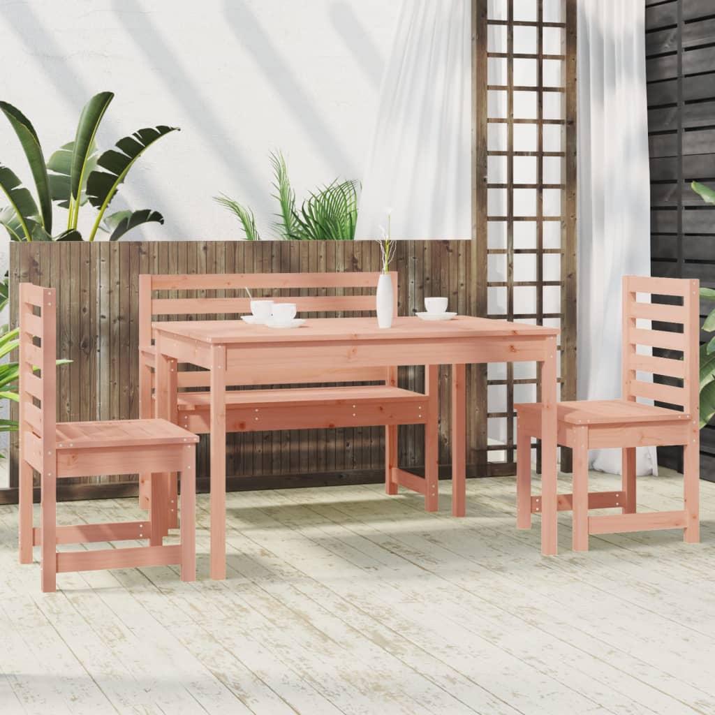 Diese klassische Gartengarnitur aus Holz eignet sich perfekt für den Außenbereich und wird der Mittelpunkt deines Gartens, deiner Terrasse oder deines Innenhofs sein. Massives Douglasienholz: Die Garten-Essgruppe ist aus massivem Douglasienholz gefertigt. Massives Douglasienholz ist ein sehr langlebiges Material, das sich perfekt für den Außenbereich eignet. Douglasienholz ist selbst bei Witterungseinflüssen sehr robust und erfordert wenig Pflege.Praktische Tischplatte: Der Esstisch verfügt über eine robuste Tischplatte. Darauf finden Snacks, Getränke und Lieblingsdekorationen Platz.Komfortables Sitzerlebnis: Dank der Sitzflächen und Rückenlehen mit Latten-Design bieten die Gartenstühle höchsten Komfort.Breite Anwendung: Mit ihrem schlichten und zeitlosen Design ist diese Garten-Essgruppe für Balkone, Gärten, Terrassen usw. geeignet. Hinweis:Damit deine Gartenmöbel lange schön bleiben, empfehlen wir dir, sie mit einer wasserdichten Hülle zu schützen.