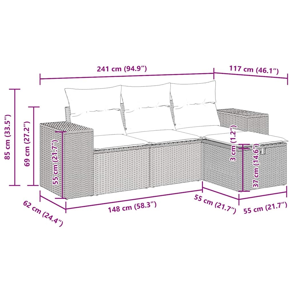 Diese Garten-Sofagarnitur ist die perfekte Ergänzung zu deinem Garten, deiner Terrasse oder deinem Innenhof. Sie bietet einen bequemen und einladenden Platz, um mit Familie und Freunden zu plaudern oder dich einfach nur zu entspannen und das Leben im Freien zu genießen. Langlebiges Material: PE-Rattan, auch als Poly Rattan bekannt, ist ein robustes, pflegeleichtes synthetisches Material, das die Optik von natürlichem Rattan aufweist. Es kennzeichnet sich durch ein geringes Eigengewicht und lässt sich einfach reinigen. Aufgrund seiner Haltbarkeit und Witterungsbeständigkeit wird es häufig bei der Herstellung von Gartenmöbeln verwendet.Stauraum mit wasserfestem Beutel: Jedes Gartensofa verfügt über ein Staufach unter der Sitzfläche, das mit einem wasserfesten Beutel zur Aufbewahrung von Kissen, Spielzeug und anderen Gegenständen versehen ist. Die Kissen sind mit Bezügen versehen und lassen sich mit Klettverschlüssen fest und sicher am Sofa befestigen.Vielseitiger Fußhocker: Der Hocker ist vielseitig einsetzbar und dient als bequeme Fußstütze beim Entspannen auf dem Sofa oder als zusätzlicher Sitzplatz in deinem Garten.Abnehmbarer und waschbarer Bezug: Diese Sitzkissen verfügen über abnehmbare Bezüge für einfaches Waschen und Pflegen.Robustes und stabiles Gestell: Der pulverbeschichtete Stahlgestell ist stark, stabil, langlebig sowie korrosions- und wetterbeständig, um eine lang anhaltende Leistung zu gewährleisten. Gut zu wissen:Wir empfehlen dir, deine Gartenmöbel mit einer wasserdichten Hülle zu schützen, um lange Zeit eine ansprechende Optik aufzuweisen.
