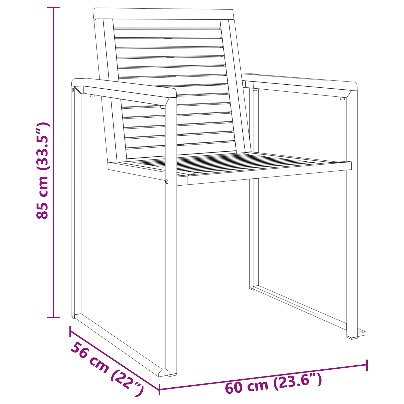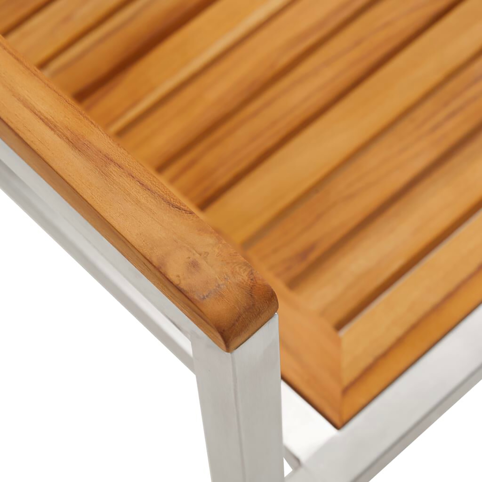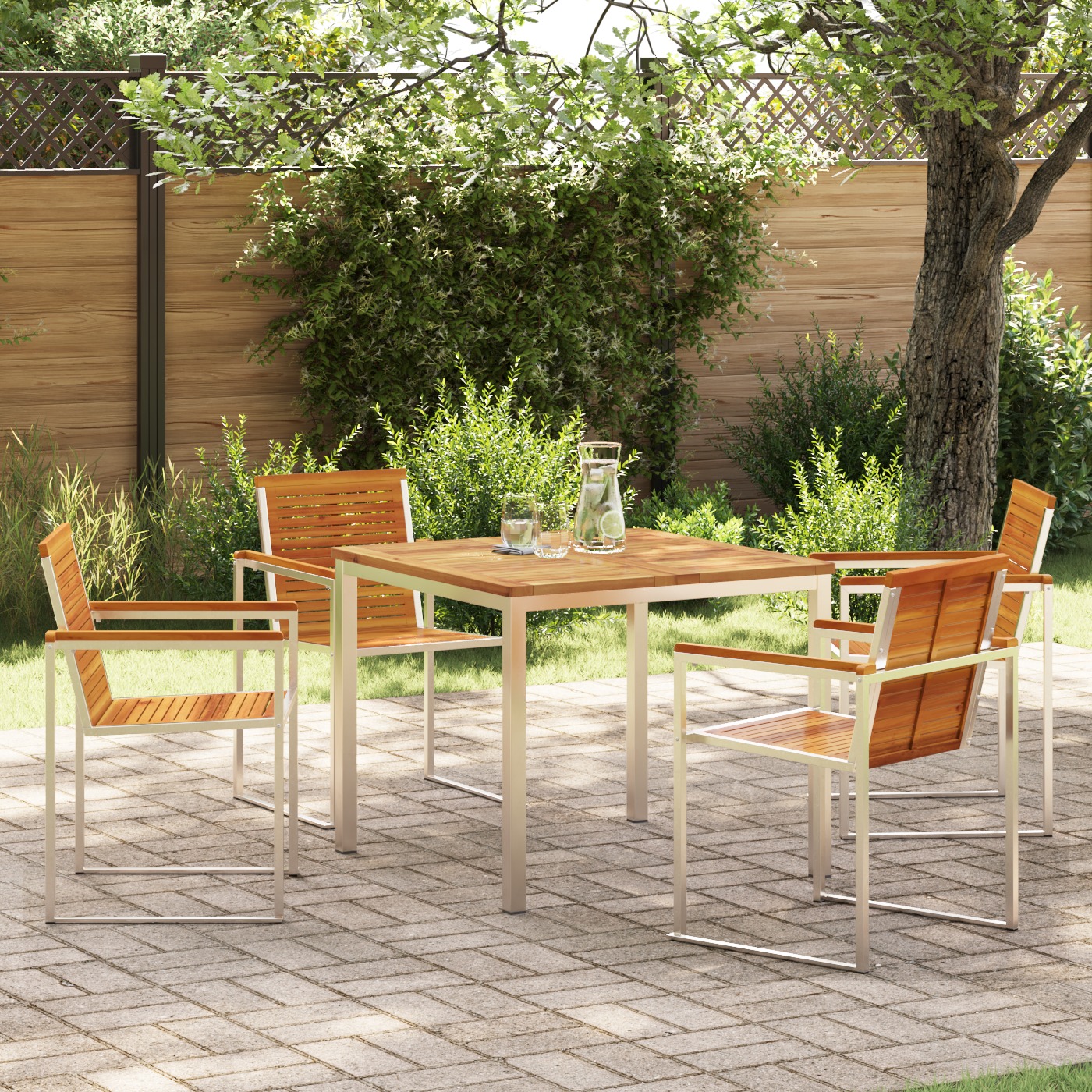Dieses 5-teilige Garten-Essset schafft eine einladende Atmosphäre in jedem Außenbereich wie Terrassen oder Balkonen. Das moderne Design mit einer geschlitzten Tischplatte sieht in natürlichen Umgebungen fantastisch aus. Perfekt für Treffen von bis zu vier Personen, genau richtig für Mahlzeiten oder geselliges Beisammensein, um deine Zeit im Freien angenehm zu gestalten. Haltbare Materialien: Hergestellt aus massivem Akazienholz und einem stabilen, rostfreien Stahlrahmen, ist dieses Essset auf Langlebigkeit ausgelegt und bietet Zuverlässigkeit. Stylishes Design: Die geschlitzte Tischplatte aus Holz und die eleganten Metallbeine verleihen einen trendigen Look und bringen Charme in jeden Garten oder Terrasse. Kompakte Größe: Der quadratische Tisch und die stapelbaren Stühle nutzen den Platz optimal aus - ideal für kleinere Outdoor-Settings. Komfortable Features: Jeder Stuhl hat flache Armlehnen und eine geräumige Sitzfläche, wodurch Gäste bequem für längere Outdoor-Mahlzeiten oder Treffen sitzen können. Einfache Pflege: Die geölte Oberfläche hebt die Maserung des Holzes hervor und schützt es vor Feuchtigkeit, was die Pflege mit nur einem schnellen Wischen zum Kinderspiel macht.