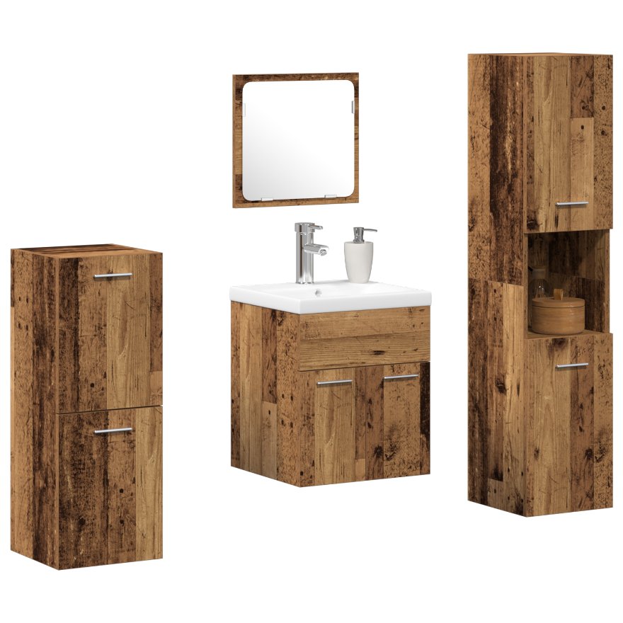 Dieses praktische Badezimmermöbel-Set bringt rustikalen Flair ins Spiel und verbindet Stil mit Funktionalität für ein schönes Badezimmererlebnis. Es enthält einen smarten Waschbeckenschrank, viele Stauraumoptionen und einen klassischen Spiegel, damit du den Raum optimal nutzt und dabei gut aussiehst. Rustikaler Stil: Das verwitterte Altholz-Finish bringt eine warme, natürliche Stimmung in dein Badezimmer und schafft eine gemütliche Atmosphäre. Die strukturierten Oberflächen sind ein echter Hingucker und machen es zum Highlight in jedem Zuhause. Schweberegale: Die schwebenden Regale bieten dir praktische Stauraummöglichkeiten, die du nach deinen Bedürfnissen anpassen kannst, damit alles ordentlich und gut erreichbar bleibt. Massivholz-Konstruktion: Dieses Set ist aus hochwertigem Altholz gefertigt, robust für den täglichen Gebrauch und perfekt für belebte Badezimmer, während es seinen rustikalen Charme behält. Umfassendes Set: Das Set umfasst einen praktischen Vanity-Spiegel, einen geräumigen Waschbeckenschrank und zusätzlichen Stauraum, was es zum Rundum-Paket für dein Badezimmer macht. Jedes Teil arbeitet zusammen, um das Beste aus deinem Raum herauszuholen. Einfache Reinigung: Die Pflege dieser Möbel ist ganz einfach, dank der glatten Oberflächen. Wisch einfach mit einem feuchten Tuch darüber, und sie sehen frisch aus. Die robusten Materialien garantieren Langlebigkeit.