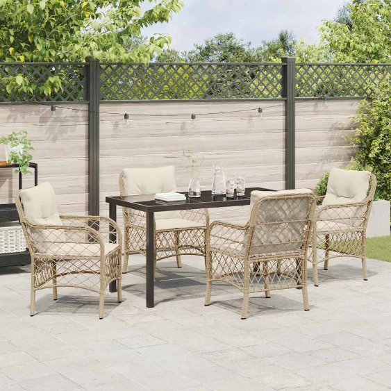 Diese Garten Essgruppe hat ein stylisches Design aus coolem beige Poly Rattan und verwandelt jeden Außenbereich in eine schicke Oase. Ideal für Patios, Balkone oder Terrassen, sorgen die geräumigen Armlehnenstühle mit bequemen Kissen für eine einladende Atmosphäre, ob zum Essen oder Entspannen. Bequemes Sitzen: Die dick gepolsterten Sitze bieten dir ein fantastisches Erlebnis, egal ob beim Essen oder beim Entspannen. Genieße stundenlangen Komfort im Freien mit Freunden oder Familie auf diesen gemütlichen Stühlen. Langlebigkeit: Hergestellt aus robustem PE-Rattan, hält dieses Garten Set allen Witterungen stand, ohne an Attraktivität zu verlieren. Es ist pflegeleicht und für eine lange Lebensdauer konzipiert. Einfache Pflege: Mit abnehmbaren Kissenbezügen ist die Reinigung dieses Sets ein Kinderspiel. Einfach abziehen, in die Waschmaschine stecken und sie sind frisch und bereit für den nächsten Einsatz. Stabile Konstruktion: Der pulverbeschichtete Stahl sorgt dafür, dass alles fest bleibt und die Sicherheit während der Nutzung gewährleistet ist. Diese solide Bauweise garantiert, dass die Möbel dir jahrelang Freude bereiten. Ideale Größe: Mit Maßen von 58.5 x 67 x 86 cm passt dieses Set problemlos in kleinere Bereiche und bietet dennoch genug Platz zum Essen. Das vielseitige Design ist für unterschiedliche Außenbereiche geeignet.