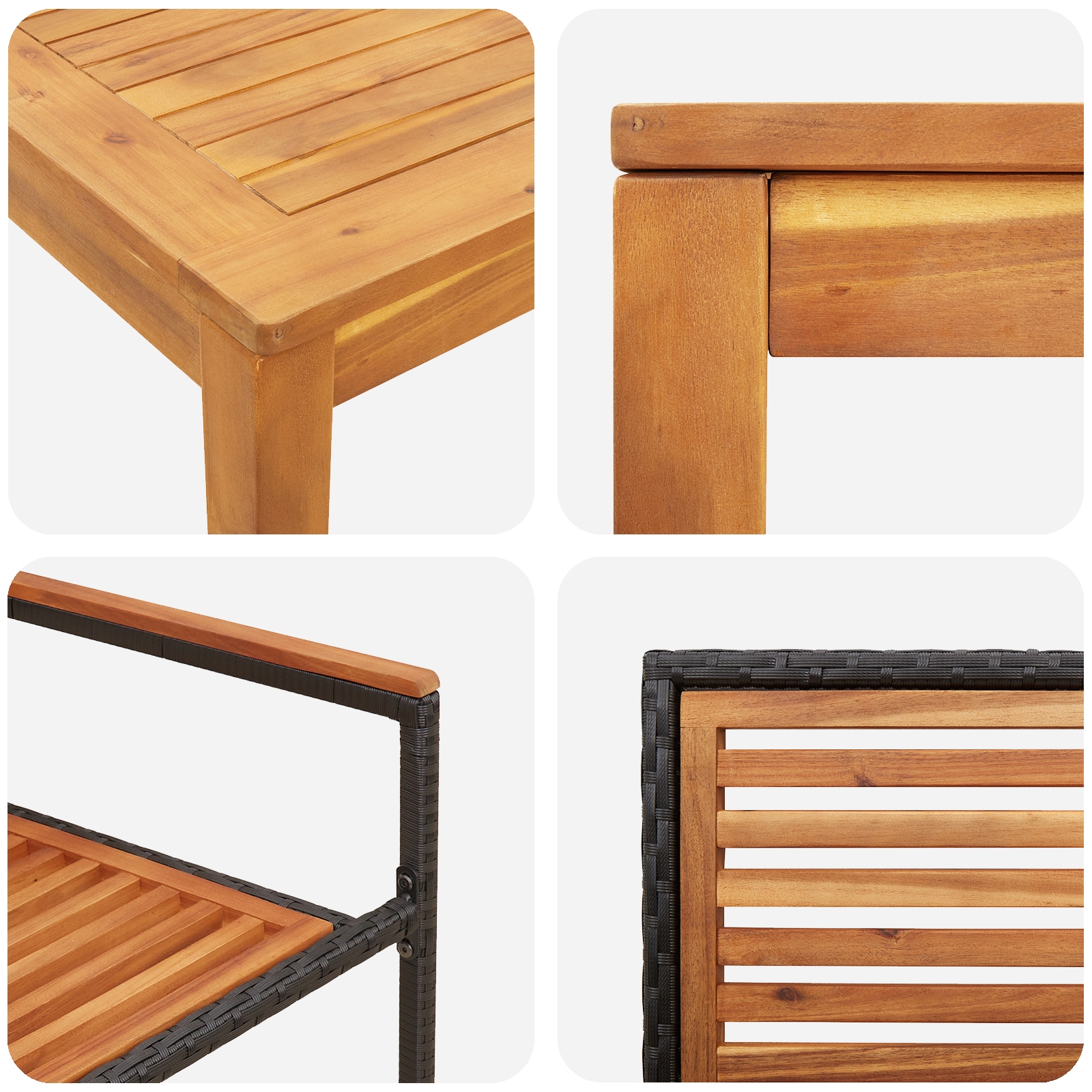 Dieses geräumige Garten Esszimmer Set macht das Essen im Freien zum Erlebnis mit seinem schickem Design und gemütlichen Sitzplätzen. Mit einem rechteckigen Tisch und vier passenden Stühlen, ist dieses Set aus massivem Akazienholz und robusten pulverbeschichteten Stahlbeinen. Es bietet die perfekte Kombination aus Stärke und Stil. Materialzusammensetzung: Hergestellt aus hochwertigem, massivem Akazienholz, das langanhaltend schön ist, und starken pulverbeschichteten Stahlbeinen, die dafür sorgen, dass es wetterfest ist. Kapazität: Das Garten Esszimmer Set bietet bequem Platz für vier Personen, ideal für Familientreffen oder gesellige Abende mit Freunden. Design: Das Set besticht durch einen modernen Stil mit strukturierter Oberfläche, die gut in verschiedene Outdoor-Umgebungen passt und das Aussehen deiner Terrasse oder deines Gartens aufwertet. Stapierbar: Die Stühle sind stapelbar und bieten eine praktische Lösung für die Lagerung, wenn sie nicht in Gebrauch sind, optimal um Platz zu sparen. Einfach zu reinigen: Die Materialien sind so gewählt, dass sie problemlos pflegbar sind, sodass du dein Outdoor-Set sorgenfrei genießen kannst.