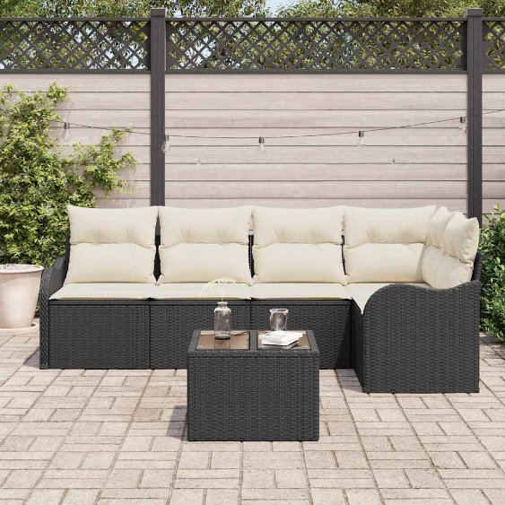 Mit diesem Outdoor-Ecksofa-Set bringst du Stil und Funktion in deinen Außenbereich. Die schicke schwarz-cremefarbene Farbkombination und das handgewebte Rattan sind der perfekte Blickfang auf Terrassen, Balkonen oder im Garten und schaffen eine einladende Atmosphäre zum Entspannen oder für gesellige Abende mit Freunden. Stilvolles Design: Die schicke schwarz-cremefarbene Kombination bringt Eleganz und verbindet sich wunderbar mit der Natur, sodass deine Umgebung einladender wirkt. Geräumige Sitzgelegenheiten: Platz für fünf Personen – perfekt für gesellige Zusammenkünfte oder ruhige Abende mit deinen Liebsten. Diese großzügige Anordnung sorgt für unvergessliche Momente unter dem offenen Himmel. Kuscheligen Komfort: Mit dicken, abnehmbaren Kissen, die für weiche Unterstützung sorgen, bleibt das Sofa gleichzeitig stilvoll. Dank des Reißverschlusses lassen sich die Kissenbezüge einfach abnehmen. Wetterbeständig: Dieses Set ist für den Außenbereich konzipiert und hält allen Wetterbedingungen stand, damit du das ganze Jahr über Spaß draußen haben kannst. Vielseitige Nutzung: Ideal zum Essen, Lesen oder einfach Entspannen – das modulare Sofa lässt sich für jeden Anlass anpassen, egal ob für Mahlzeiten im Freien oder entspannte Abende unter dem Sternenhimmel.
