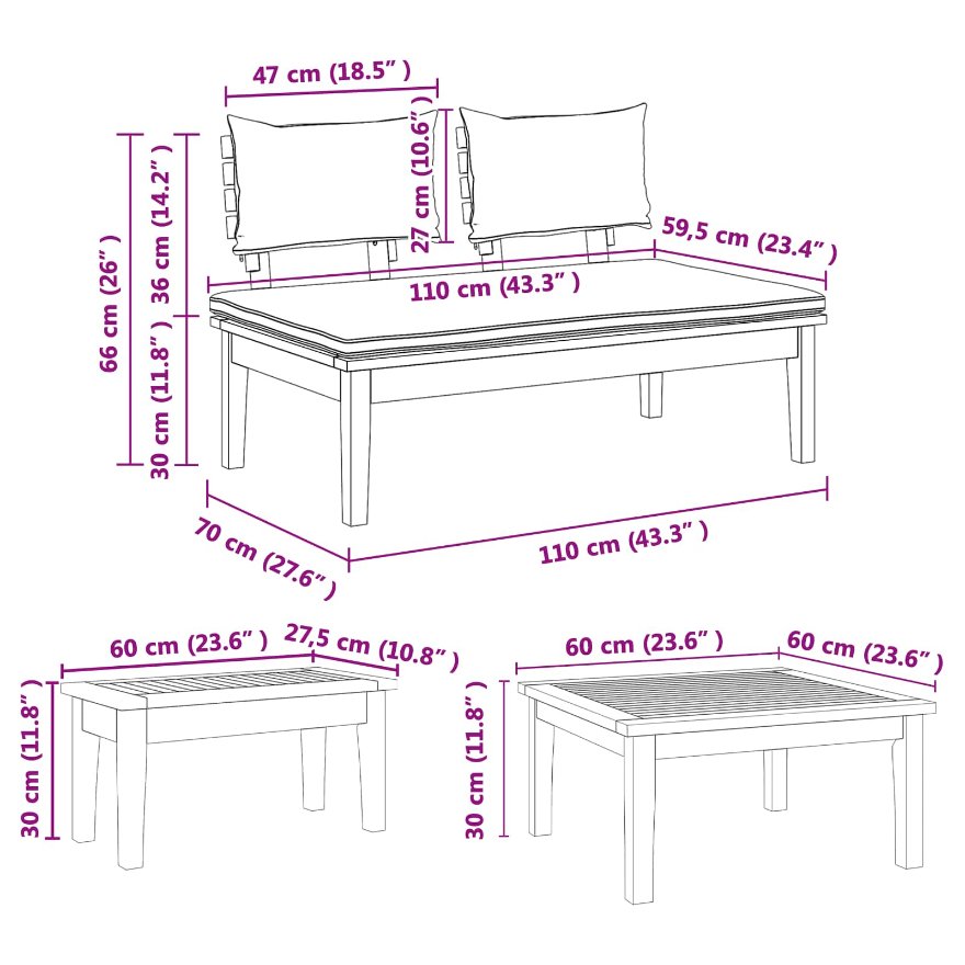 Dieses Gartenbank-Set ist perfekt, um draußen zu entspannen. Es besteht aus robustem Holz und hat bequeme, strapazierfähige Kissen, die deine Chill-Zeit besser machen. Egal, ob du eine Sommerparty feierst oder einen ruhigen Abend unter den Sternen verbringst, dieses Set bietet sowohl Komfort als auch tolles Aussehen für deinen Garten. Atmungsaktives Material: Die Kissen aus strapazierfähigem Polyester sorgen für Komfort im Sommer und lassen gleichzeitig die Luft zirkulieren. Robustes Design: Ein stabiler Rahmen aus massivem Holz garantiert Langlebigkeit und Stabilität, egal bei welchem Wetter. Kompakte Maße: Ideal für kleine Patios oder Balkone, ohne auf Sitzplatzkapazität zu verzichten. Einfache Pflege: Die Kissen haben Reißverschlüsse für einfache Reinigung, damit dein Set immer frisch aussieht. Vielfältige Nutzung: Perfekt für Familientreffen, Freundesunterhaltungen oder einfach zum Entspannen mit einem guten Buch.