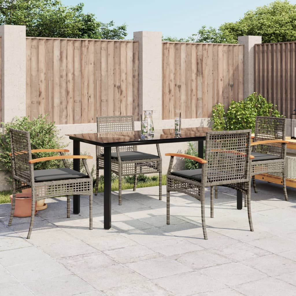 Diese Garten-Essgruppe ist eine ideale Wahl für Mahlzeiten im Freien oder einfach nur zum Entspannen im Garten, Hinterhof oder auf der Terrasse. Langlebiges Material: PE-Rattan, auch als Poly Rattan bekannt, ist ein robustes, pflegeleichtes synthetisches Material, das die Optik von natürlichem Rattan aufweist. Es kennzeichnet sich durch ein geringes Eigengewicht und lässt sich einfach reinigen. Aufgrund seiner Haltbarkeit und Witterungsbeständigkeit wird es häufig bei der Herstellung von Gartenmöbeln verwendet.Bequemes Sitzerlebnis: Dieser Gartensessel mit dick gepolsterten Kissen bietet ein angenehmes Sitzgefühl.Abnehmbarer und waschbarer Bezug: Diese Sitzkissen verfügen über abnehmbare Bezüge für einfaches Waschen und Pflegen.Tischplatte aus Glas: Die Tischplatte des Gartentisches besteht aus starkem und langlebigem Hartglas, sodass sie leicht mit einem feuchten Tuch gereinigt werden kann und deinem Außenbereich einen Hauch von Eleganz verleiht.Robuster und stabiler Rahmen: Dank des pulverbeschichteten Stahlrahmens ist das Möbelstück robust, stabil und für den täglichen Einsatz im Außenbereich geeignet. Gut zu wissen:Wir empfehlen dir, deine Gartenmöbel mit einer wasserdichten Hülle zu schützen, um lange Zeit eine ansprechende Optik aufzuweisen.