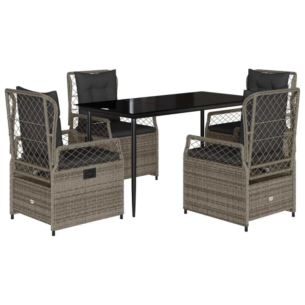 Diese Garten-Essgruppe ist eine ideale Wahl für Mahlzeiten im Freien oder einfach nur zum Entspannen im Garten, Hinterhof oder auf der Terrasse. Langlebiges Material: PE-Rattan, auch als Poly Rattan bekannt, ist ein robustes, pflegeleichtes synthetisches Material, das die Optik von natürlichem Rattan aufweist. Es kennzeichnet sich durch ein geringes Eigengewicht und lässt sich einfach reinigen. Aufgrund seiner Haltbarkeit und Witterungsbeständigkeit wird es häufig bei der Herstellung von Gartenmöbeln verwendet.Verstellbare Rückenlehne: Der Gartensessel ist mit einem Griff versehen. So kannst du die Rückenlehne durch Ziehen des Griffs verstellen und sie danach schnell wieder in ihre ursprüngliche Position bringen.Bequemes Sitzerlebnis: Dieser Gartensessel mit dick gepolsterten Kissen bietet ein angenehmes Sitzgefühl.Abnehmbarer und waschbarer Bezug: Das Sitzkissen verfügt über einen abnehmbaren Bezug, der sich ganz einfach waschen und pflegen lässt.Tischplatte aus Glas: Die Tischplatte des Gartentisches besteht aus starkem und langlebigem Hartglas, sodass sie leicht mit einem feuchten Tuch gereinigt werden kann und deinem Außenbereich einen Hauch von Eleganz verleiht. Gut zu wissen:Wir empfehlen dir, deine Gartenmöbel mit einer wasserdichten Hülle zu schützen, um lange Zeit eine ansprechende Optik aufzuweisen.