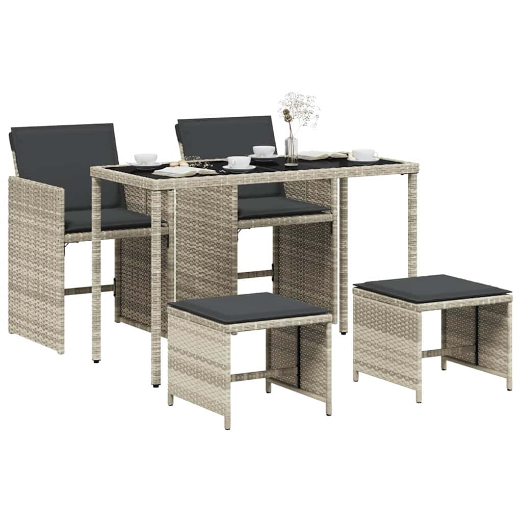 Diese Garten-Essgruppe ist eine ideale Wahl für Mahlzeiten im Freien oder einfach nur zum Entspannen im Garten, Hinterhof oder auf der Terrasse. Langlebiges Material: PE-Rattan, auch als Poly Rattan bekannt, ist ein robustes, pflegeleichtes synthetisches Material, das die Optik von natürlichem Rattan aufweist. Es kennzeichnet sich durch ein geringes Eigengewicht und lässt sich einfach reinigen. Aufgrund seiner Haltbarkeit und Witterungsbeständigkeit wird es häufig bei der Herstellung von Gartenmöbeln verwendet.Platzsparende Aufbewahrung: Dank der klappbaren Rückenlehne lassen sich die Stühle unter dem Tisch verstauen. Zudem finden auch die Hocker Platz unter den Stühlen, sodass die gesamte Essgruppe bei Nichtgebrauch eine platzsparende Würfelform bildet, um deinen verfügbaren Platz optimal auszunutzen.Bequemes Sitzerlebnis: Dieser Gartensessel mit dick gepolsterten Kissen bietet ein angenehmes Sitzgefühl.Abnehmbarer und waschbarer Bezug: Die Sitzkissen verfügen über abnehmbare Bezüge, die sich ganz einfach waschen und reinigen lassen. Dank der Klappen an der Rückseite können die Sitzkissen ganz einfach an den Stühlen befestigt werden.Tischplatte aus Glas: Die Tischplatte des Gartentisches besteht aus starkem und langlebigem Hartglas, sodass sie leicht mit einem feuchten Tuch gereinigt werden kann und deinem Außenbereich einen Hauch von Eleganz verleiht. Gut zu wissen:Wir empfehlen dir, deine Gartenmöbel mit einer wasserdichten Hülle zu schützen, um lange Zeit eine ansprechende Optik aufzuweisen.