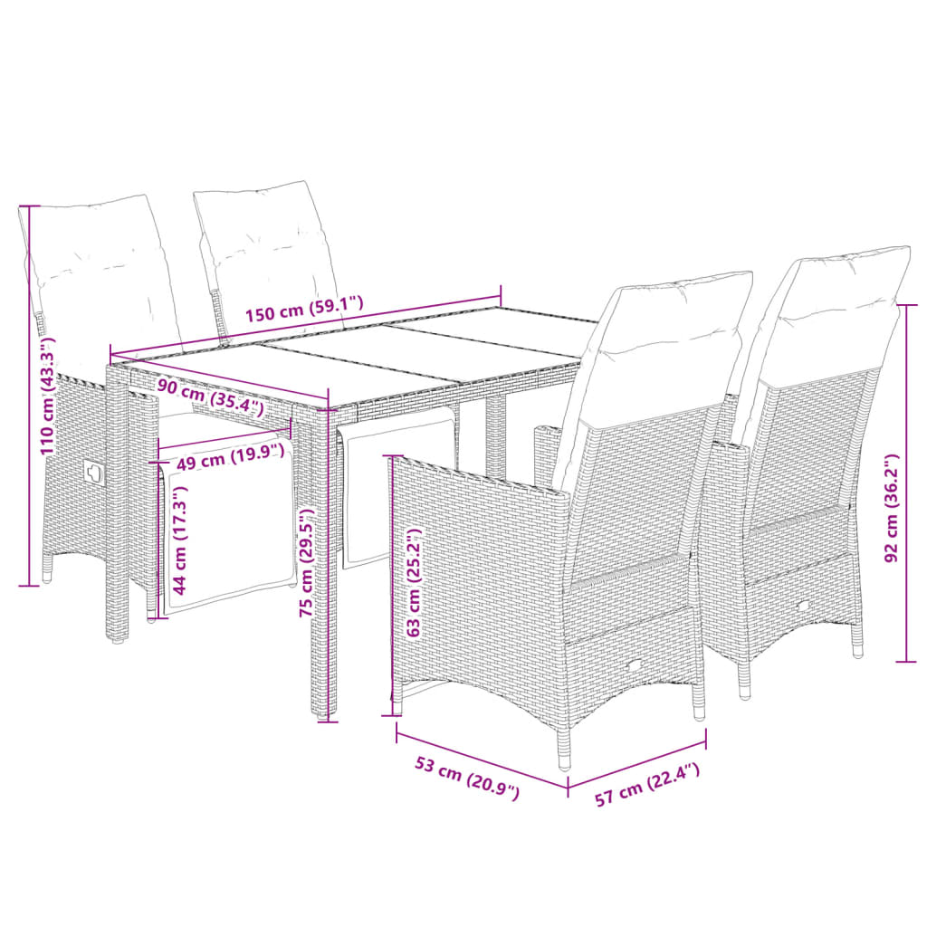 Diese Garten-Essgruppe ist eine ideale Wahl für Mahlzeiten im Freien oder einfach nur zum Entspannen im Garten, Hinterhof oder auf der Terrasse. Langlebiges Material: PE-Rattan, auch als Poly Rattan bekannt, ist ein robustes, pflegeleichtes synthetisches Material, das die Optik von natürlichem Rattan aufweist. Es kennzeichnet sich durch ein geringes Eigengewicht und lässt sich einfach reinigen. Aufgrund seiner Haltbarkeit und Witterungsbeständigkeit wird es häufig bei der Herstellung von Gartenmöbeln verwendet.Verstellbare Rückenlehne und Fußstütze: Der Gartensessel ist mit einem Griff versehen. So kannst du die Rückenlehne und den Fußteil durch Ziehen des Griffs verstellen und sie danach schnell wieder in ihre ursprüngliche Position bringen.Stabile und pflegeleichte Tischplatte: Dieser Gartentisch besitzt eine Tischplatte aus Akazienholz, die robust und langlebig ist und sich leicht mit einem feuchten Tuch reinigen lässt.Bequemes Sitzerlebnis: Dieses Gartenmöbel-Set wird samt dick gepolsterten Kissen geliefert, um höchsten Sitzkomfort zu bieten.Abnehmbarer und waschbarer Bezug: Die Sitzkissen verfügen über abnehmbare Bezüge, die sich ganz einfach waschen und reinigen lassen. Dank der Klappen an der Rückseite können die Rückenkissen ganz einfach an den Rückenlehnen befestigt werden. Gut zu wissen:Wir empfehlen dir, deine Gartenmöbel mit einer wasserdichten Hülle zu schützen, um lange Zeit eine ansprechende Optik aufzuweisen.