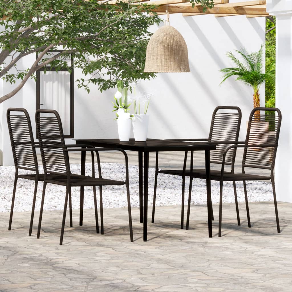 Mit ihrem eleganten Design und klaren Linien ist diese trendige Essgruppe eine ausgezeichnete Wahl für Garten, Terrasse, Küche und sogar Esszimmer. Die schlichte Eleganz dieser Essgarnitur macht Ihr tägliches Abendessen zu etwas ganz Besonderem. Diese Garten-Essgruppe besitzt pulverbeschichtete Stahlrahmen, die Tisch und Stühle stabil und langlebig machen. Die Rückenlehne und der Sitz sind aus gezwirntem Baumwollseil gefertigt, das sich weich anfühlt und auf eine lange Lebensdauer ausgelegt ist. Da die Tischplatte aus Hartglas besteht, lässt sie sich ganz einfach reinigen und bietet auch den perfekten Platz für Speisen, Getränke und verschiedene Dekoartikel. Hinweis:Um die Lebensdauer Ihrer Gartenmöbel zu verlängern, empfehlen wir Ihnen, diese regelmäßig zu reinigen und im Freien vor Niederschlägen oder starken Sonnenstrahlen zu schützen.Reinigung: Verwenden Sie eine milde Seifenlösung.Lagerung: Wenn möglich, an einem kühlen, trockenen Ort im Innenbereich lagern. Wenn das Produkt im Freien gelagert wird, schützen Sie es mit einer wasserdichten Abdeckung. Wischen und trocknen Sie das überschüssige Wasser oder den Schnee nach Regen oder Schneefall von ebenen Flächen. Sorgen Sie für eine ausreichende Luftzirkulation, um feuchtigkeitsbedingte Schäden zu vermeiden.