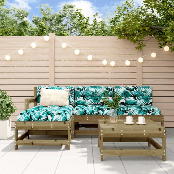 Dieses Garten-Lounge-Set aus Holz, das sich durch sein Latten-Design auszeichnet, ist eine großartige Bereicherung für deinen Garten, deine Terrasse oder deinen Balkon, um eine gemütliche Zeit mit der Familie oder Freunden zu verbringen. Imprägniertes Holz: Massives Kiefernholz ist ein wunderschönes Naturmaterial. Kiefernholz weist eine gerade Maserung auf und die Aststellen verleihen dem Material seine charakteristische, rustikale Optik. Die Imprägnierung ist ein Konservierungsprozess, der unter Verwendung von Autoklaven durchgeführt wird. Die Druckbehandlung erhöht die Widerstandskraft gegen Verrottung und Witterung.Robuster und stabiler Rahmen: Dank des Holzrahmens ist das Lounge-Set robust, stabil und für den täglichen Einsatz im Freien geeignet.Modulares Design: Die Sofagarnitur lässt sich flexibel und leicht umstellen und mit anderen modularen Elementen aus unserem Webshop frei kombinieren, um dein ganz persönliches Garten-Lounge-Set zusammenzustellen! Gut zu wissen:Damit deine Gartenmöbel lange schön bleiben, empfehlen wir dir, sie mit einer wasserdichten Hülle zu schützen.Die Kissen sind nicht im Lieferumfang enthalten.