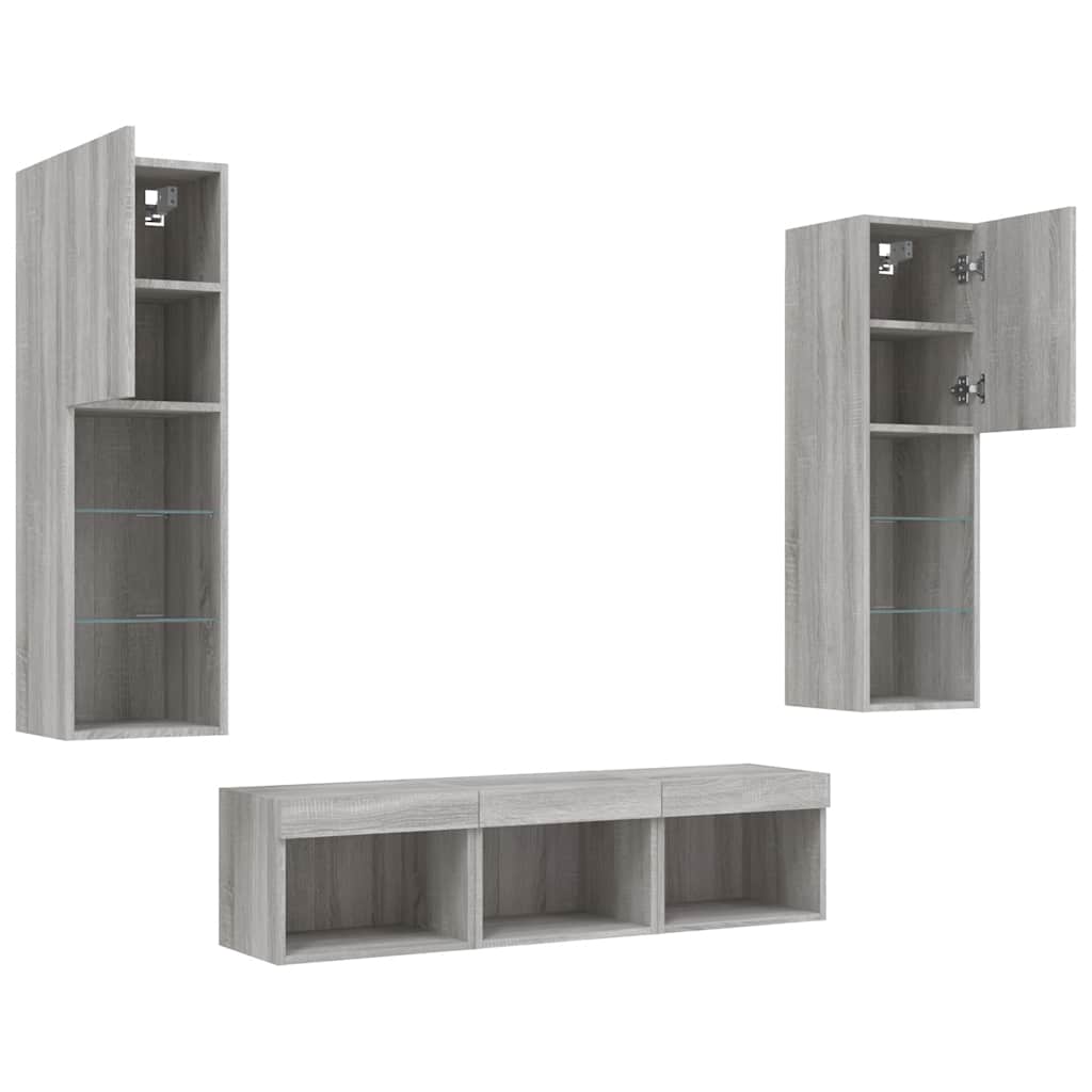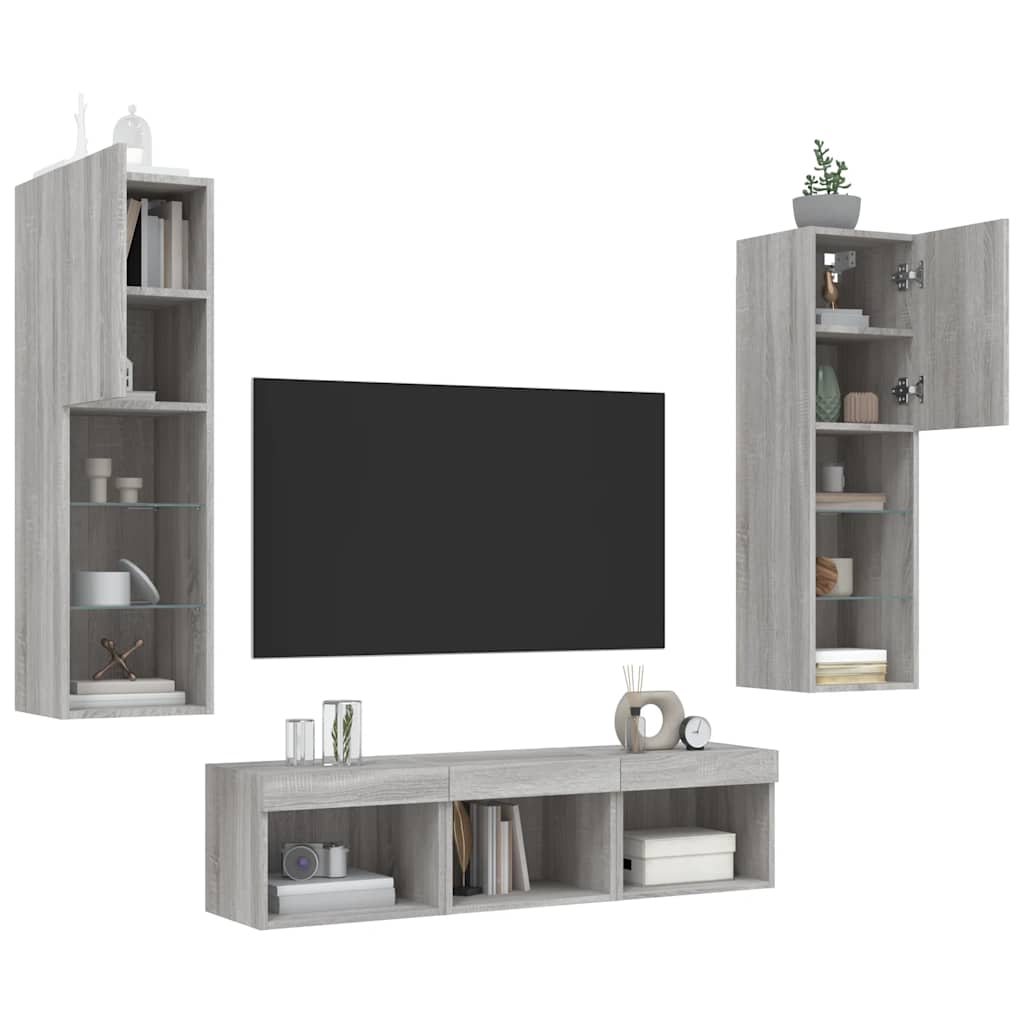 Diese TV-Wandschränke bieten eine perfekte Lösung, um zusätzlichen Stauraum in deinem Wohnraum zu schaffen und für Ordnung zu sorgen. Robustes Material: Holzwerkstoff ist ein Material von außergewöhnlicher Qualität mit glatter Oberfläche, das sich durch Festigkeit, Stabilität und Feuchtigkeitsbeständigkeit auszeichnet.RGB-LED-Leuchten: Die Wohnwand ist mit lebendigen RGB-LED-Leuchten ausgestattet. Mit verschiedenen anpassbaren Menüs kannst du die Farbe der Lichter mühelos wechseln und sie sogar auf automatische Anpassung einstellen. Diese LED-Leuchten unterstreichen nicht nur den modernen Look des TV-Wandschranks, sondern tragen auch zu seiner trendigen Optik bei.Wandmontage: Der TV-Schrank lässt sich an der Wand montieren, um zusätzlichen Stauraum zu schaffen. Auf diese Weise kannst du deine Bodenfläche maximieren und für Ordnung im Raum sorgen.Reichlich Stauraum: Das TV-Wandschrank-Set bietet reichlich Platz, um Bücher, DVDs, Zeitschriften, Medien und andere Alltagsgegenstände übersichtlich und griffbereit zu verstauen.Vielseitiges Design: Du kannst den Schrank als TV-Schrank verwenden oder ihn im Arbeitszimmer an der Wand montieren, um Utensilien oder andere Gegenstände bequem aufzubewahren. Zudem verwandelt er eine leere Wand sofort in ein Design-Element. Gut zu wissen:Schrauben und Dübel für die Innenseite der Wand sind nicht enthalten. Wir empfehlen dir, Schrauben und Dübel zu finden und zu verwenden, die speziell für deine Wände geeignet sind. Wenn du dir nicht sicher bist, kannst du dich an einen Fachmann wenden. Bitte lies und befolge jeden Schritt in der Anleitung.Das Produkt verfügt über einen USB-Anschluss, für den eine zertifizierte 5V-USB-Stromquelle erforderlich ist (nicht im Lieferumfang enthalten).